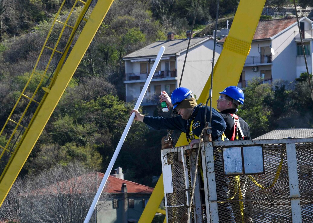 RIJEKA, Croatia (April 8, 2021) Information Technician 3rd Class Liam Delaney, right, and Information Technician 2nd Class Tristan Roberts are hoisted in a crane to conduct maintenance on an antenna during scheduled maintenance aboard the expeditionary sea base USS Hershel “Woody” Williams (ESB 4) in Rijeka, Croatia, April 8, 2021. Hershel “Woody” Williams is on a scheduled deployment in the U.S. 6th Fleet area of operations in support of U.S. national interests and security in Europe and Africa. (U.S. Navy photo by Mass Communication Specialist 2nd Class Eric Coffer)