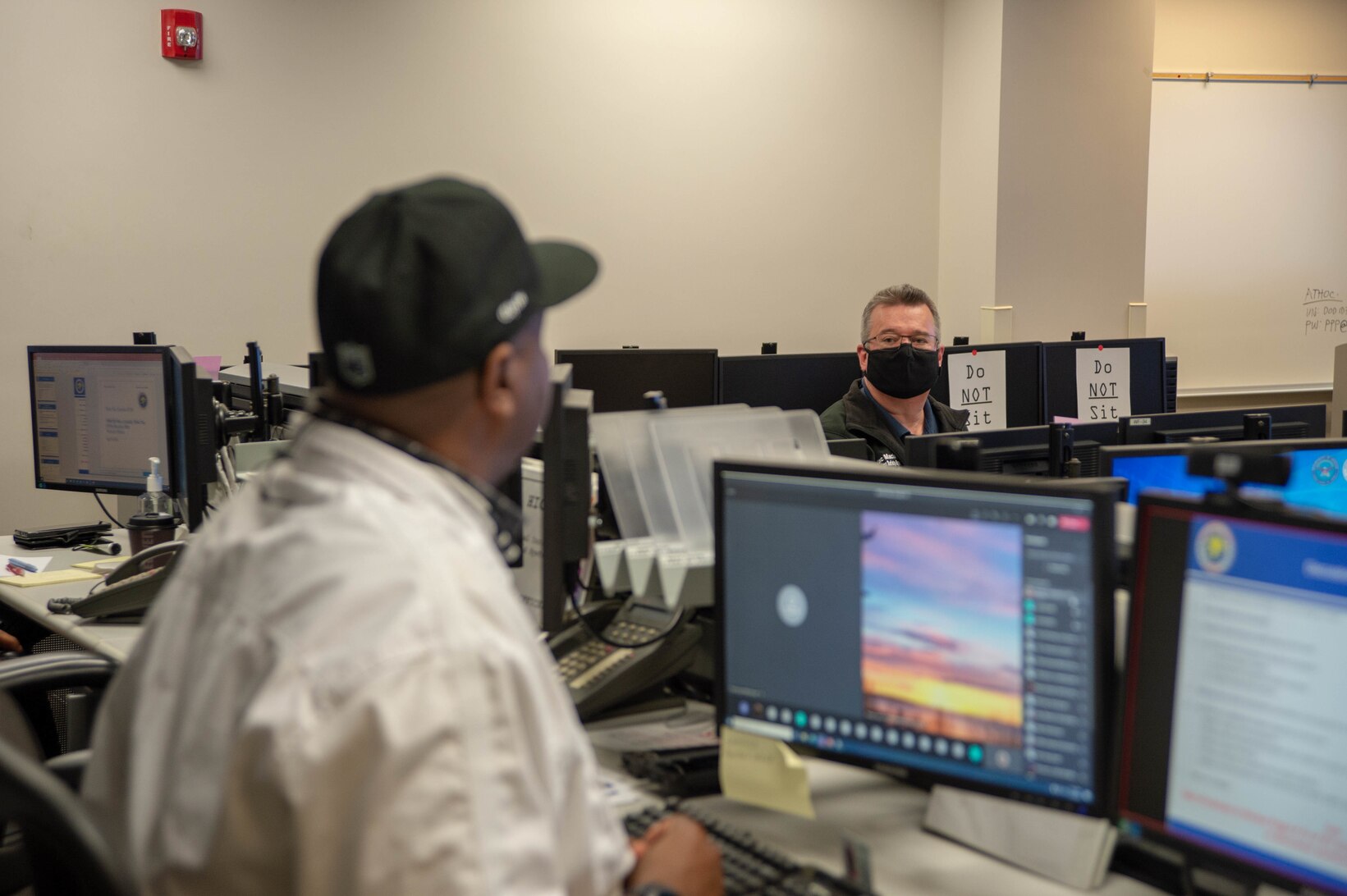 SAN DIEGO (April 16, 2021) Alexander Maclachlan, a senior safety specialist assigned to Naval Medical Center San Diego (NMCSD), right, interacts with Christopher Springer, head of NMCSD's Emergency Management, during a virtual mass casualty drill at NMCSD's Hospital Command Center. This year�s mass casualty drill was held virtually due to coronavirus (COVID-19) procedures and guidelines. NMCSD�s number one priority is providing the safest, highest quality patient-centered medical care for our veterans, service members and their families. NMCSD is committed to operational readiness, outstanding customer service and always delivering world-class health care. (U.S. Navy photo by Mass Communication Specialist 2nd Class Erwin Jacob V. Miciano)