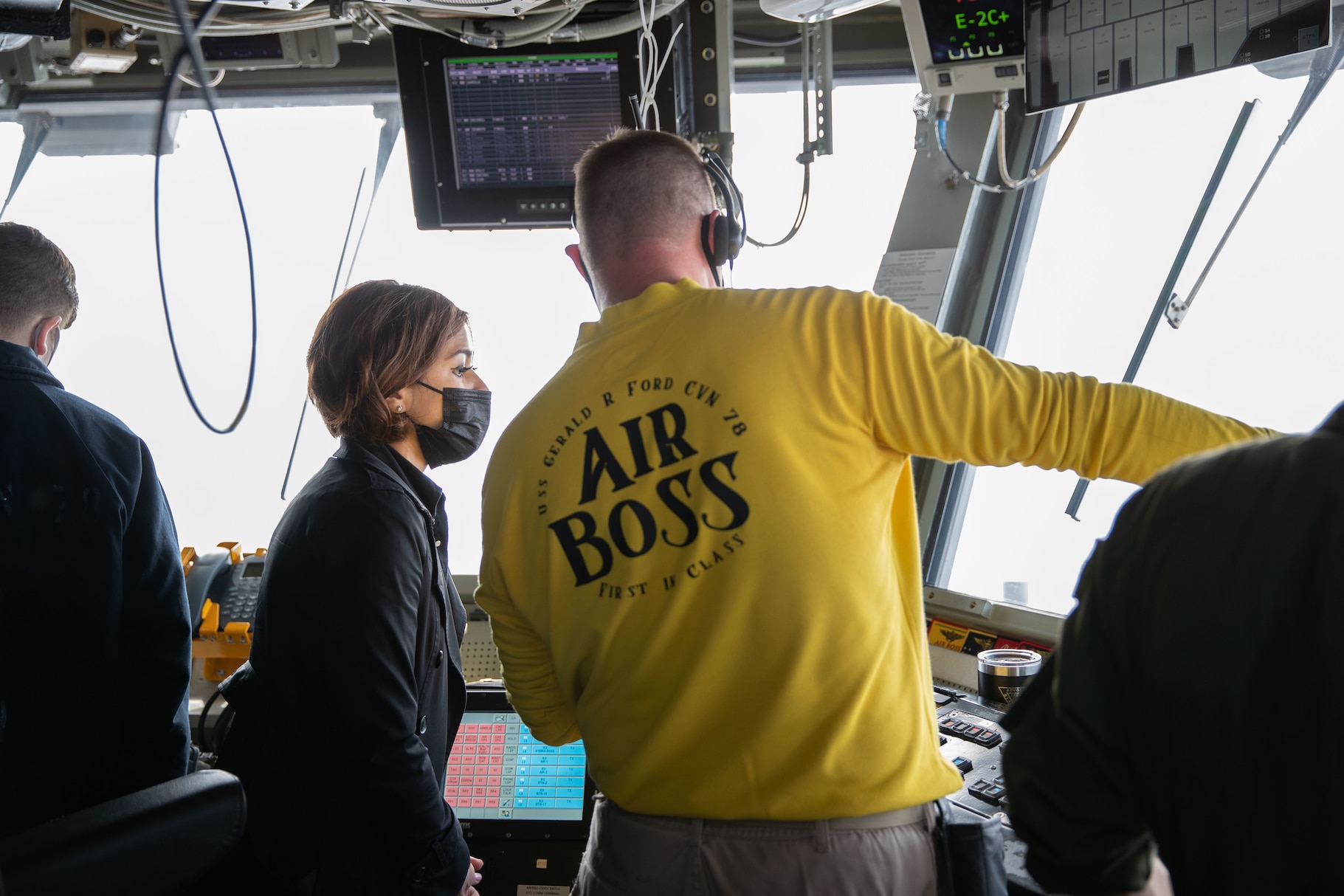 ATLANTIC OCEAN (April 18, 2021) Ms. Alaleh Jenkins, performing the duties of Assistant Secretary of the Navy, Financial Management and Comptroller, left, receives a brief from Cmdr. John Peterson, the air boss of the aircraft carrier USS Gerald R. Ford (CVN 78), in primary flight control, April 18, 2021. During her visit, Jenkins also met with Carrier Strike Group (CSG) 12 commander and other warfare commanders to receive an in-depth look at underway operations and significant milestones made during the ship's last independent steaming event (ISE) as part of post-delivery test and trials. During the ship's final ISE, it completed combat systems ship qualification trials, integrated CSG operations and cyclic flight operations. (U.S. Navy photo by Mass Communication Specialist 3rd Class Dalton Lowing)