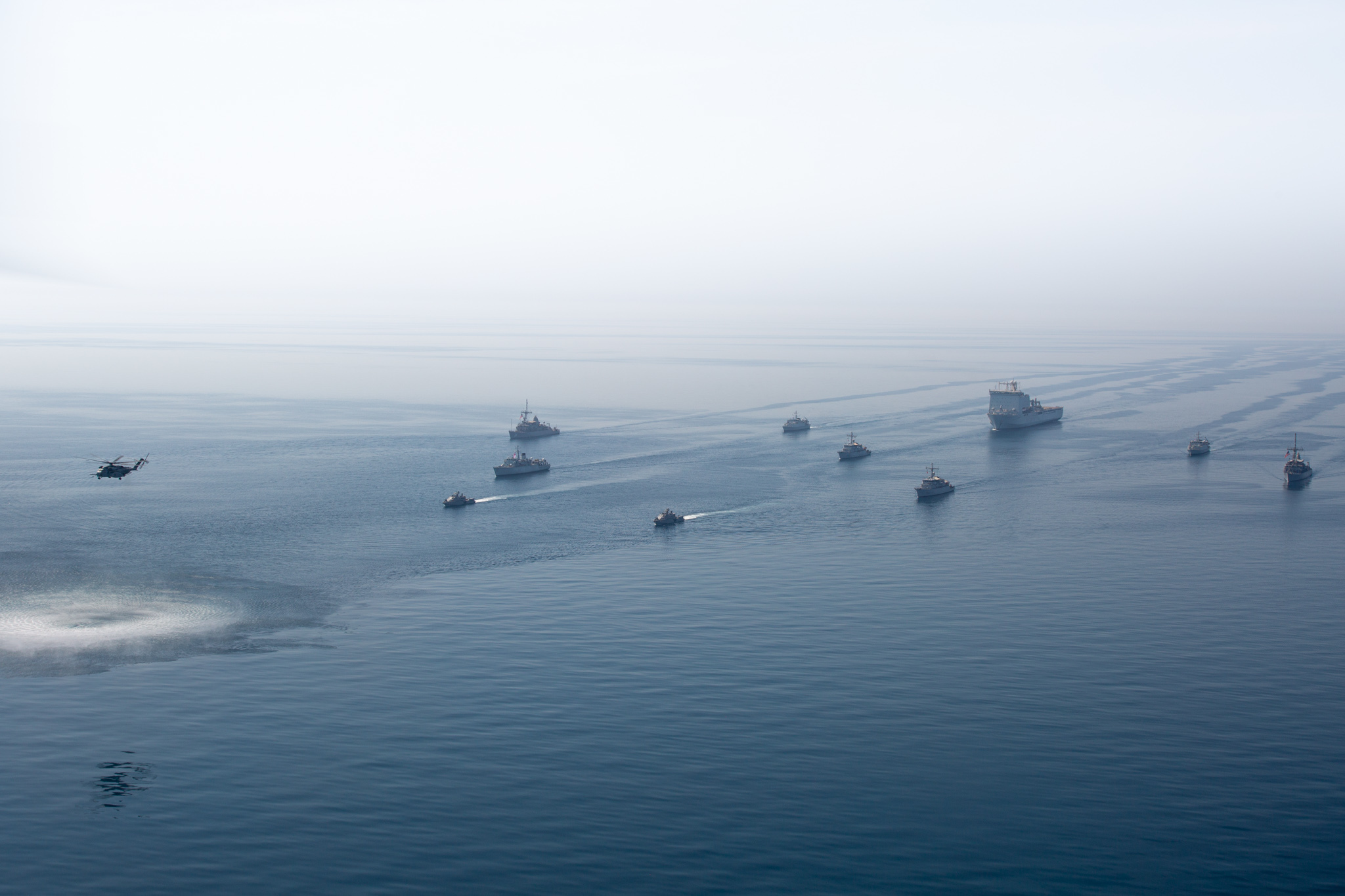 210421-A-BD272-0359 ARABIAN GULF (April 21, 2021) - A multinalional group of mine countermeasure ships from the French Marine Nationale, UK Royal Navy, U.S. Navy and a MH-53E Sea Dragon helicopter, attached to the “Blackhawks” of Helicopter Mine Countermeasures Squadron (HM-15), operate in formation during exercise Artemis Trident 21 in the Arabian Gulf, April 21. Artemis Trident 21 is a multilateral mine countermeasures exercise between the UK, Australia, France and U.S., designed to enhance mutual interoperability and capabilities in mine hunting and clearance, maritime security and dive operations, allowing participating naval forces to effectively develop the necessary skills to address threats to regional security, freedom of navigation and the free flow of commerce. (U.S. Army photo by Spc. Theoren Neal)
