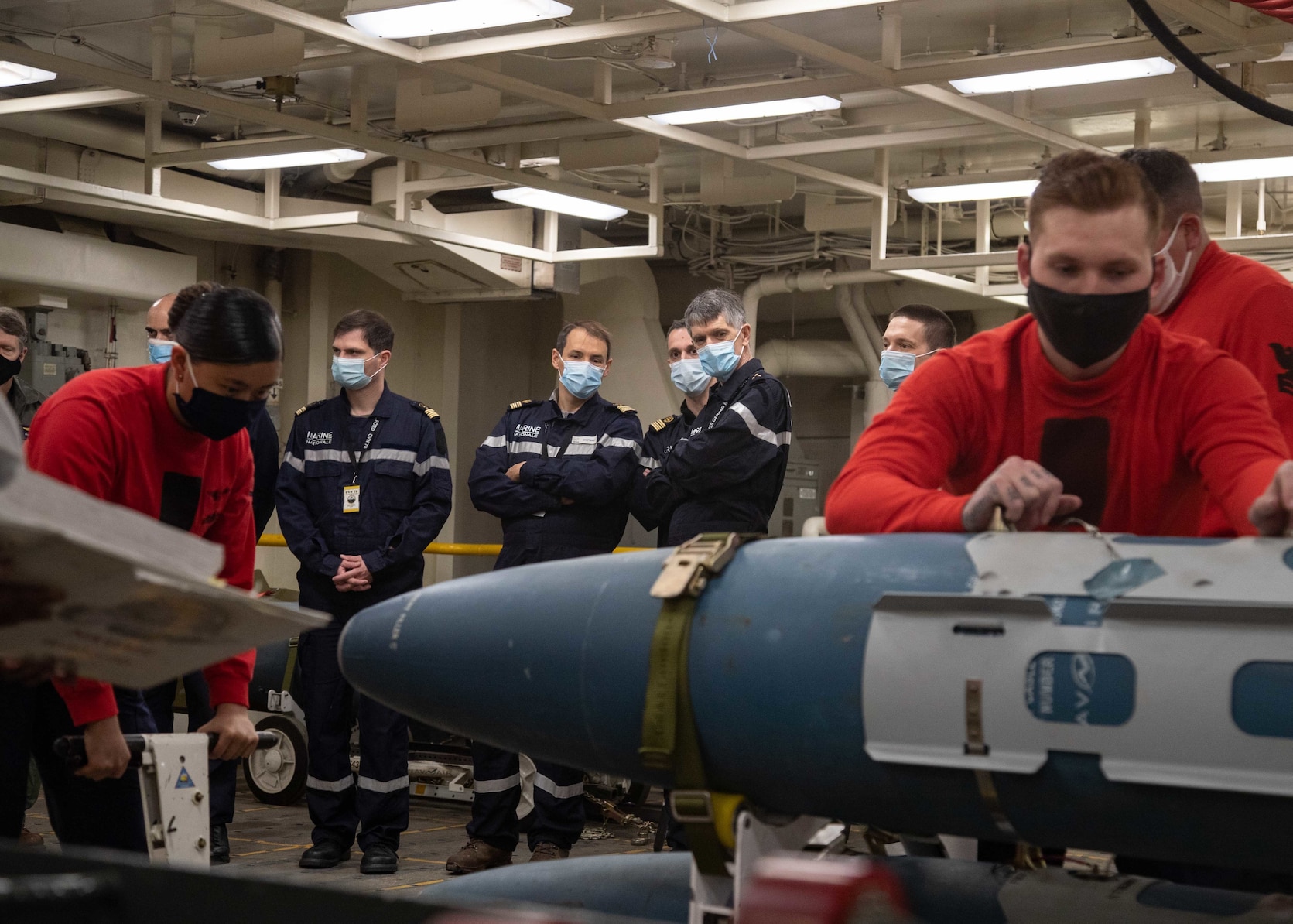 ATLANTIC OCEAN (April 18, 2021) French Armaments Procurements Agency members observe Sailors assigned tothe aircraft carrier USS Gerald R. Ford (CVN 78) weapons department build a training bomb in the weapons magazine during a ship tour, April 24, 2021. French Armaments Procurements Agency executive leadership visited Gerald R. Ford to view the electromagnetic aircraft launch system (EMALS) and advanced arresting gear (AAG) in operation, to enable France to refine the design of the future French carrier. Procurement of EMALS and AAG by France and the adoption of a Ford-class carrier flight deck operations model will ensure continued interoperability between both nations. Gerald R. Ford is underway in the Atlantic Ocean conducting its final independent steaming event of post-delivery test and trials. (U.S. Navy photo by Mass Communication Specialist 3rd Class Zachary Melvin)