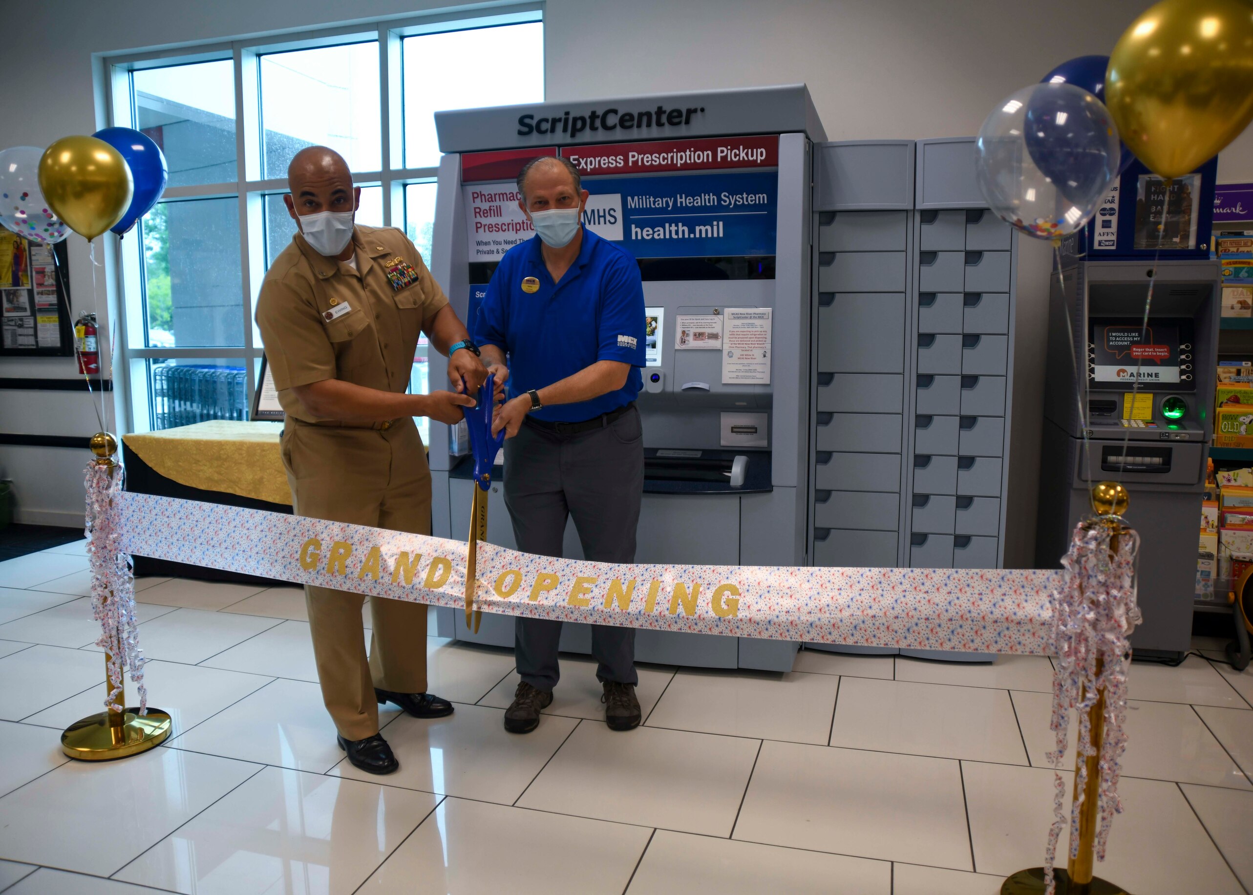 CAMP LEJEUNE, N.C. (May 12, 2021) Naval Medical Center Camp Lejeune holds a ribbon cutting ceremony for the new Asteres ScriptCenter automated kiosk and locker system.The new kiosk system is the first of its kind to be used by NMCCL, and will be located at the Marine Corps Air Station New River Marine Corps Exchange. Prescriptions are filled at the Main Pharmacy and then transported and securely loaded into the kiosk to await pickup by the beneficiary. The new kiosk provides beneficiaries additional flexibility for picking up prescription refills. (U.S. Navy photo)