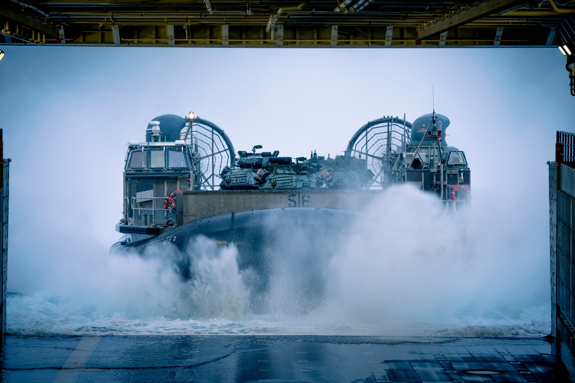 PACIFIC OCEAN (May 11, 2021) U.S. Navy Landing Craft, Air Cushion 56, assigned to Assault Craft Unit 5, prepares to enter the well deck of the amphibious transport dock USS Portland (LPD 27), transporting Marines and equipment with Light Armored Reconnaissance Company, Battalion Landing Team 1/1, 11th Marine Expeditionary Unit (MEU). Marines and Sailors of the Essex Amphibious Ready Group (ARG) and the 11th MEU are conducting routine training off the coast of southern California. (U.S. Marine Corps photo by Cpl. Ian M. Simmons)