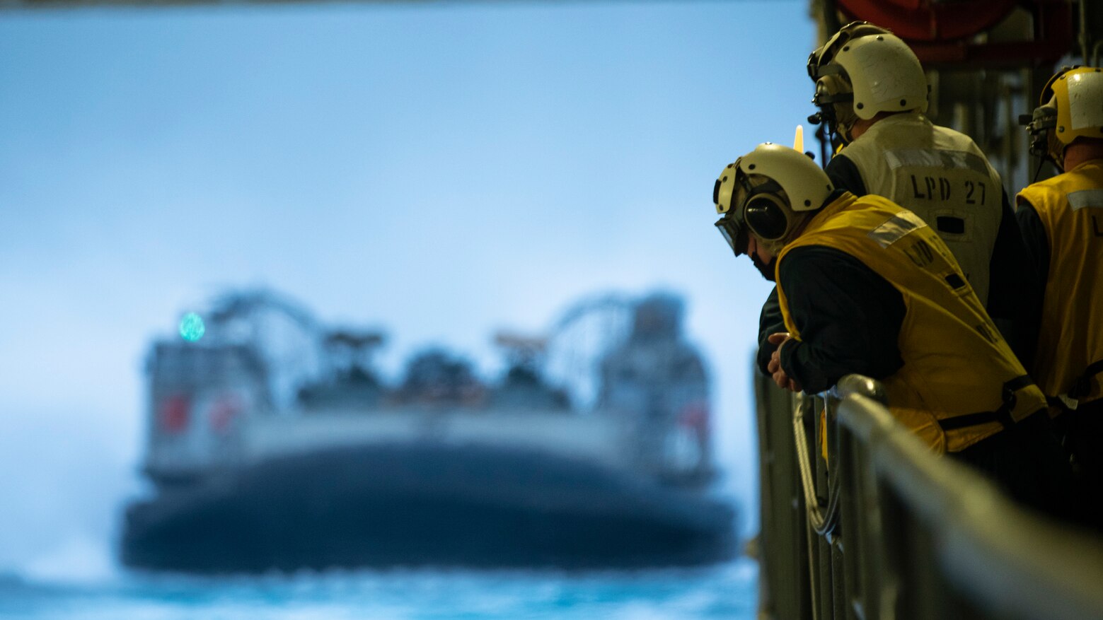PACIFIC OCEAN (May 11, 2021) Sailors assigned to the amphibious transport dock USS Portland (LPD 27) watch as Landing Craft, Air Cushion 76 with Assault Craft Unit 5 prepares to enter Portland�s well deck. Marines and Sailors of the Essex Amphibious Ready Group (ARG) and the 11th Marine Expeditionary Unit (MEU) are conducting routine training off the coast of southern California. (U.S. Marine Corps photo by Cpl. Ian M. Simmons)