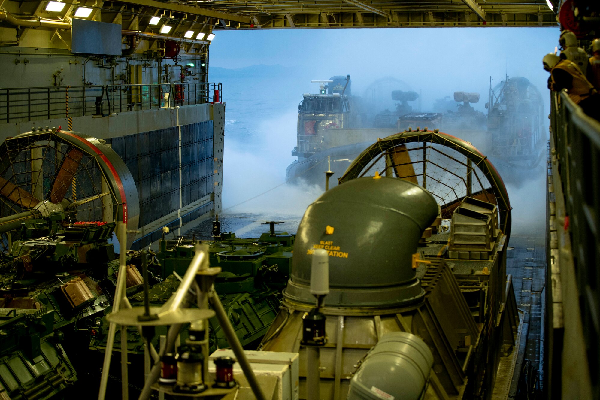 PACIFIC OCEAN (May 11, 2021) U.S. Navy Landing Craft, Air Cushion 76, assigned to Assault Craft Unit 5, enters the well deck of the amphibious transport dock USS Portland (LPD 27), transporting Marines and equipment with Light Armored Reconnaissance Company, Battalion Landing Team 1/1, 11th Marine Expeditionary Unit (MEU). Marines and Sailors of the Essex Amphibious Ready Group (ARG) and the 11th MEU are conducting routine training off the coast of southern California. (U.S. Marine Corps photo by Cpl. Ian M. Simmons)