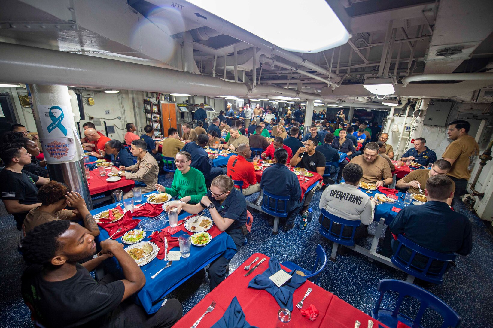 ARABIAN SEA (May 20, 2021) Sailors celebrate a birthday meal for the month of May on the mess decks aboard the aircraft carrier USS Dwight D. Eisenhower (CVN 69) in the Arabian Sea. The Dwight D. Eisenhower Carrier Strike Group is deployed to the U.S. 5th Fleet area of operations in support of naval operations and providing airpower to protect U.S. and coalition forces as they conduct drawdown operations from Afghanistan. (U.S. Navy photo by Mass Communication Specialist Seaman Orion K. Shotton)