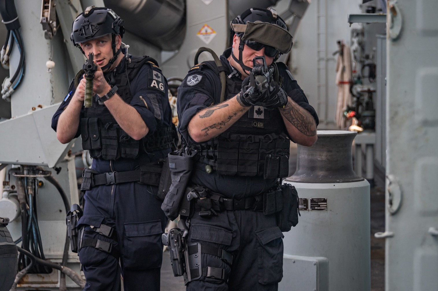 ATLANTIC OCEAN (May 21, 2021) Royal Canadian Navy sailors assigned to the naval boarding party team aboard the Canadian navy frigate HMCS Halifax (FFH 330), flagship of Standing NATO Maritime Group 1, conduct a boarding exercise off the coast of Portugal, May 21, 2021, during Exercise Steadfast Defender 21. The exercise is part of Halifax's combat enhancement and force integration training. Steadfast Defender is a defensive exercise based on an Article 5 scenario which is designed to deter aggression and respond to crisis if necessary. (Photo courtesy of the Royal Canadian Navy by Sailor 1st Class Bryan Underwood)
