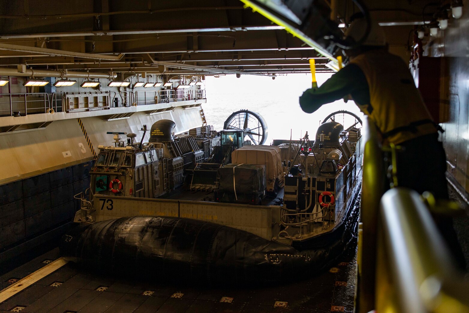 PACIFIC OCEAN (May 25, 2021) Boatswain’s Mate 2nd Class Cory Marks, from Houston, signals to a Landing Craft, Air Cushion (LCAC) during well deck operations aboard amphibious assault ship USS Essex (LHD 2), May 25. Sailors and Marines of the Essex Amphibious Ready Group (ARG) and the 11th Marine Expeditionary Unit (MEU) are underway conducting integrated training off the coast of southern California. (U.S. Navy photo by Mass Communication Specialist 3rd Class Wesley Richardson)