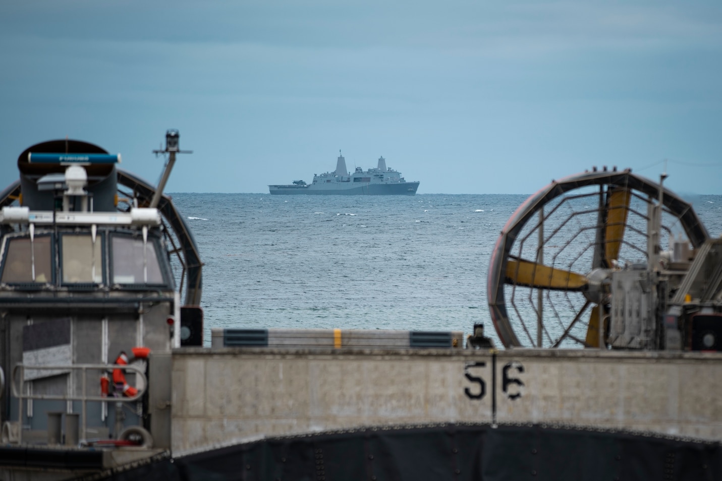 SAN CLEMENTE ISLAND, Calif. (May 15, 2021) The amphibious transport dock ship USS Portland (LPD 27) sails in the Pacific Ocean behind Landing Craft, Air Cushion 56, assigned to Assault Craft Unit 5, during an expeditionary advance base exercise, May 15, 2021. Marines and Sailors of the 11th Marine Expeditionary Unit (MEU) and Essex Amphibious Ready Group (ARG) are conducting integrated training on and off the coast of southern California. (U.S. Marine Corps photo by Sgt. Alexis Flores)