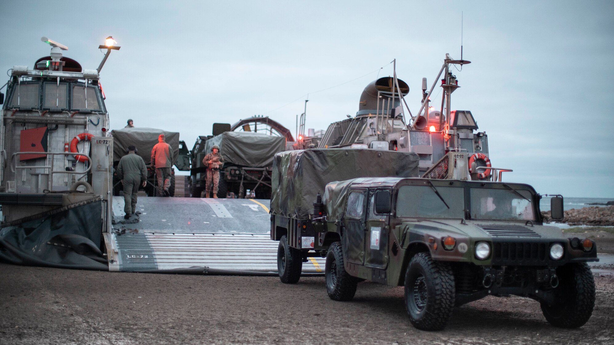 SAN CLEMENTE ISLAND, California (May 15, 2021) U.S. Marines with the 11th Marine Expeditionary Unit (MEU) offload a Humvee from Landing Craft, Air Cushion 56, assigned to Assault Craft Unit 5, during an expeditionary advance base exercise, May 15, 2021. Marines and Sailors of the 11th MEU and Essex Amphibious Ready Group (ARG) are conducting integrated training on and off the coast of southern California. (U.S. Marine Corps photo by Sgt. Alexis Flores)