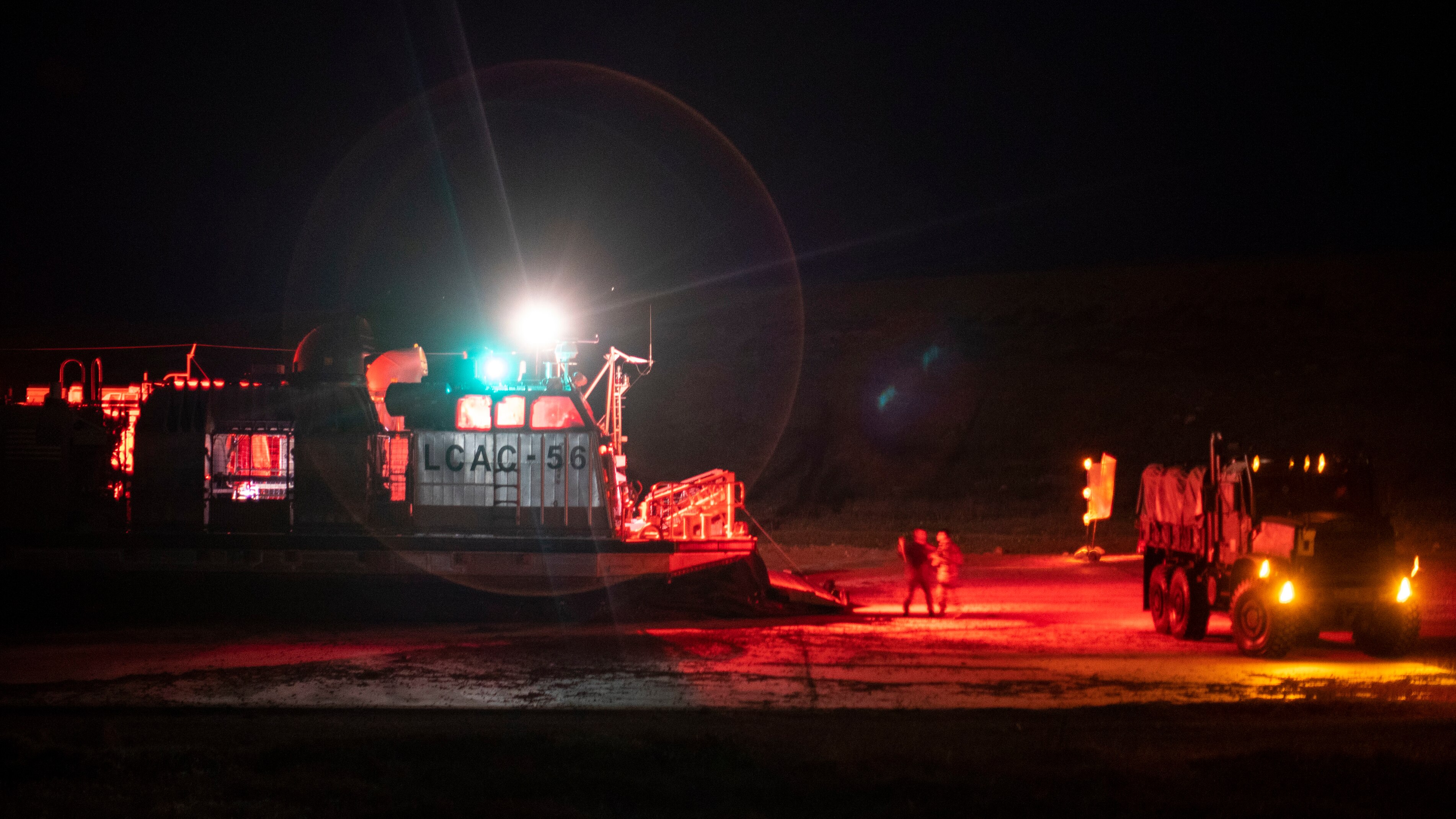 SAN CLEMENTE ISLAND, California (May 15, 2021) U.S. Marines with the 11th Marine Expeditionary Unit (MEU) offload personnel and equipment from Landing Craft, Air Cushion 56, assigned to Assault Craft Unit 5, during an expeditionary advance base exercise, May 15, 2021. Marines and Sailors of the 11th MEU and Essex Amphibious Ready Group (ARG) are conducting integrated training on and off the coast of southern California. (U.S. Marine Corps photo by Sgt. Alexis Flores)