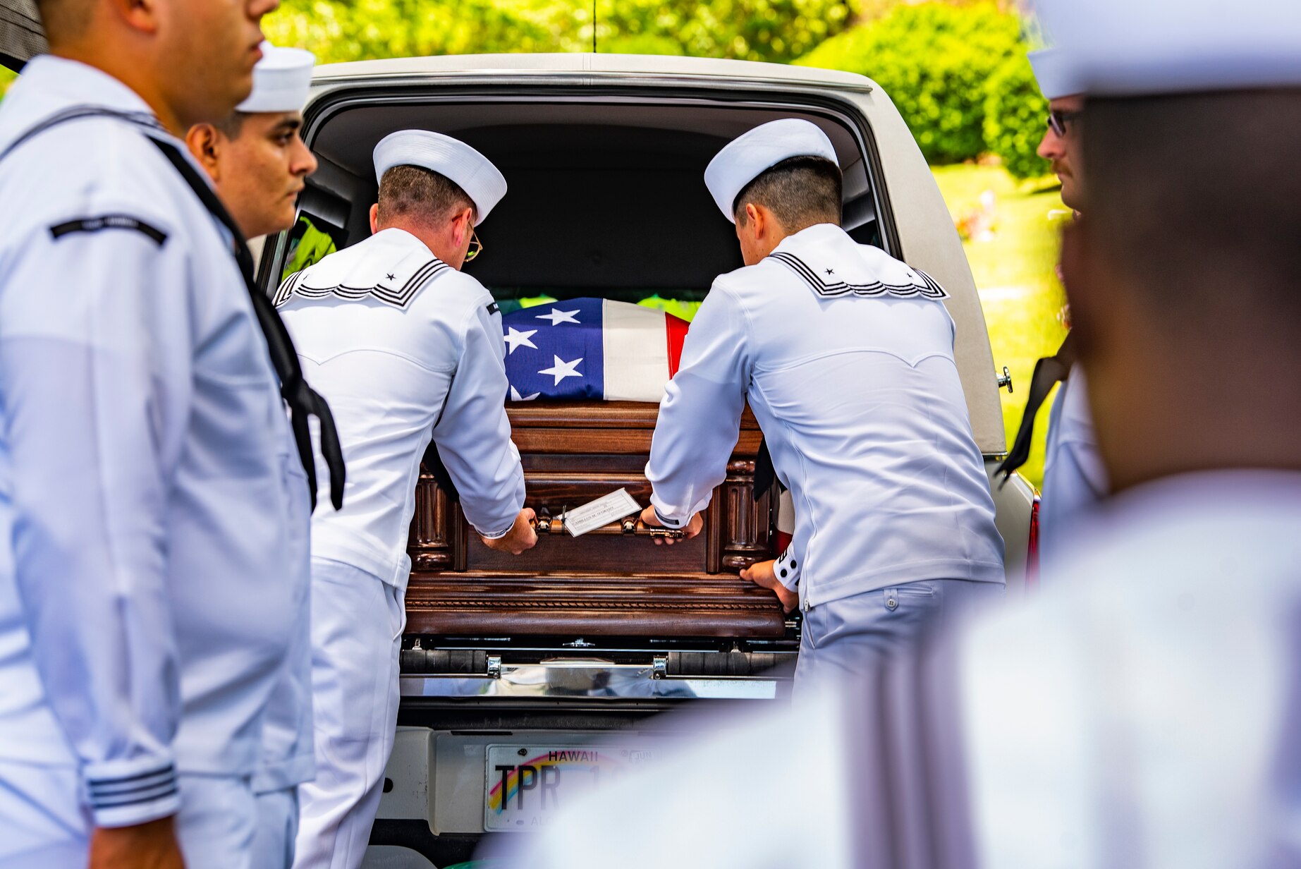 HONOLULU (June 1, 2021) Sailors assigned to Navy Region Hawaii and the Defense POW/MIA Accounting Agency (DPAA) conduct a funeral for U.S. Navy Navy Seaman 1st Class Camillus M. O’Grady, 19, of Greenleaf, Kansas, at the National Memorial Cemetery of the Pacific in Honolulu, Hawaii, June 1, 2021. O’Grady was assigned to the battleship USS Oklahoma (BB-37), which sustained fire from Japanese aircraft and multiple torpedo hits causing the ship to capsize and resulted in the deaths of more than 400 crew members on Dec. 7, 1941, at Ford Island in Pearl Harbor. O’Grady was recently identified through DNA analysis by the DPAA forensic laboratory and laid to rest with full military honors. (U.S. Army photo by Staff Sgt. Michael O'Neal)