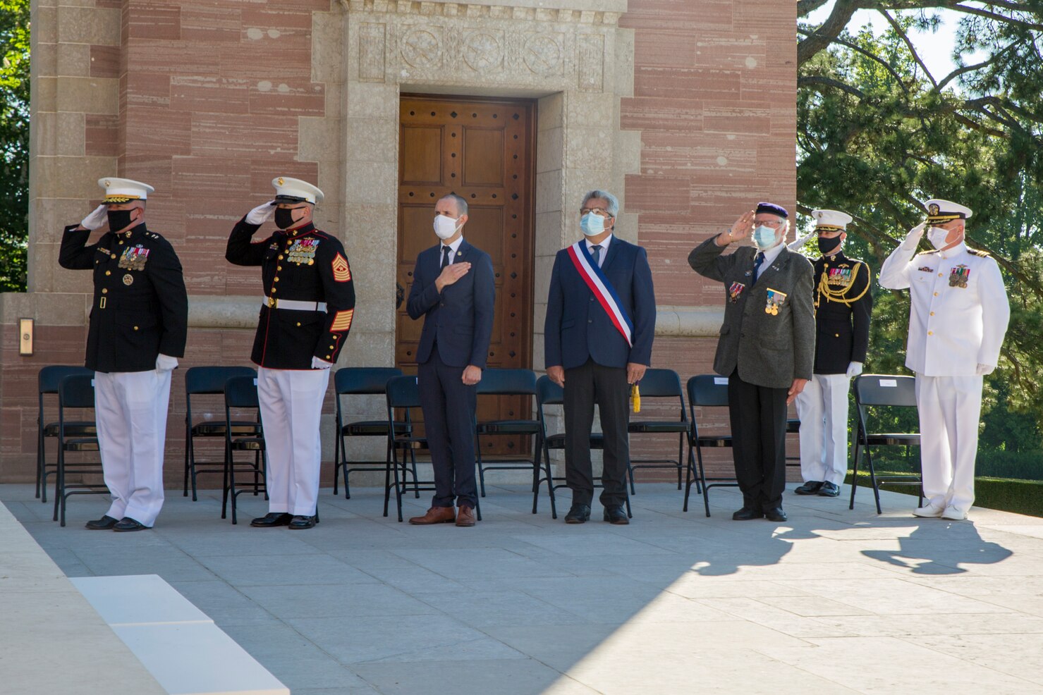 SERINGES-ET-NESLES, France (May 30, 2021) Participants render honors for the U.S. National Anthem during a ceremony at the Oise-Aisne American Cemetery near Seringes-et-Nesles, France, May 30, 2021. The ceremony was held Memorial Day weekend in commemoration of the 103rd anniversary of the battle of Belleau Wood, conducted to honor the legacy of service members who gave their lives in defense of the United States and European allies. This was the first time since the battle over a century ago that U.S. Marine Corps, U.S. Army, U.S. Navy, French, and German service members were all present for the ceremonies. (U.S. Marine Corps photo by Staff Sgt. Brytani Musick)