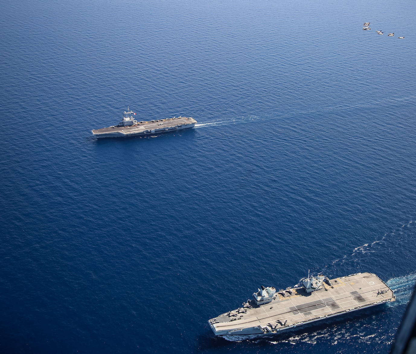 MEDITERRANEAN SEA (June 3, 2021) Aircraft from Marine Fighter Attack Squadron (VMFA) 211 and Carrier Strike Group (CSG) 21 fly over the Royal Navy aircraft carrier HMS Queen Elizabeth (R09), bottom, and the French navy aircraft carrier FS Charles de Gaulle (R91) in the Mediterranean Sea. The U.S., French, and United Kingdom navies regularly operate together, including the ongoing NATO exercise Steadfast Defender and Mine Countermeasures Exercise in the Arabian Gulf this past April. (U.S. Marine Corps photo by 1st Lt. Zachary Bodner)