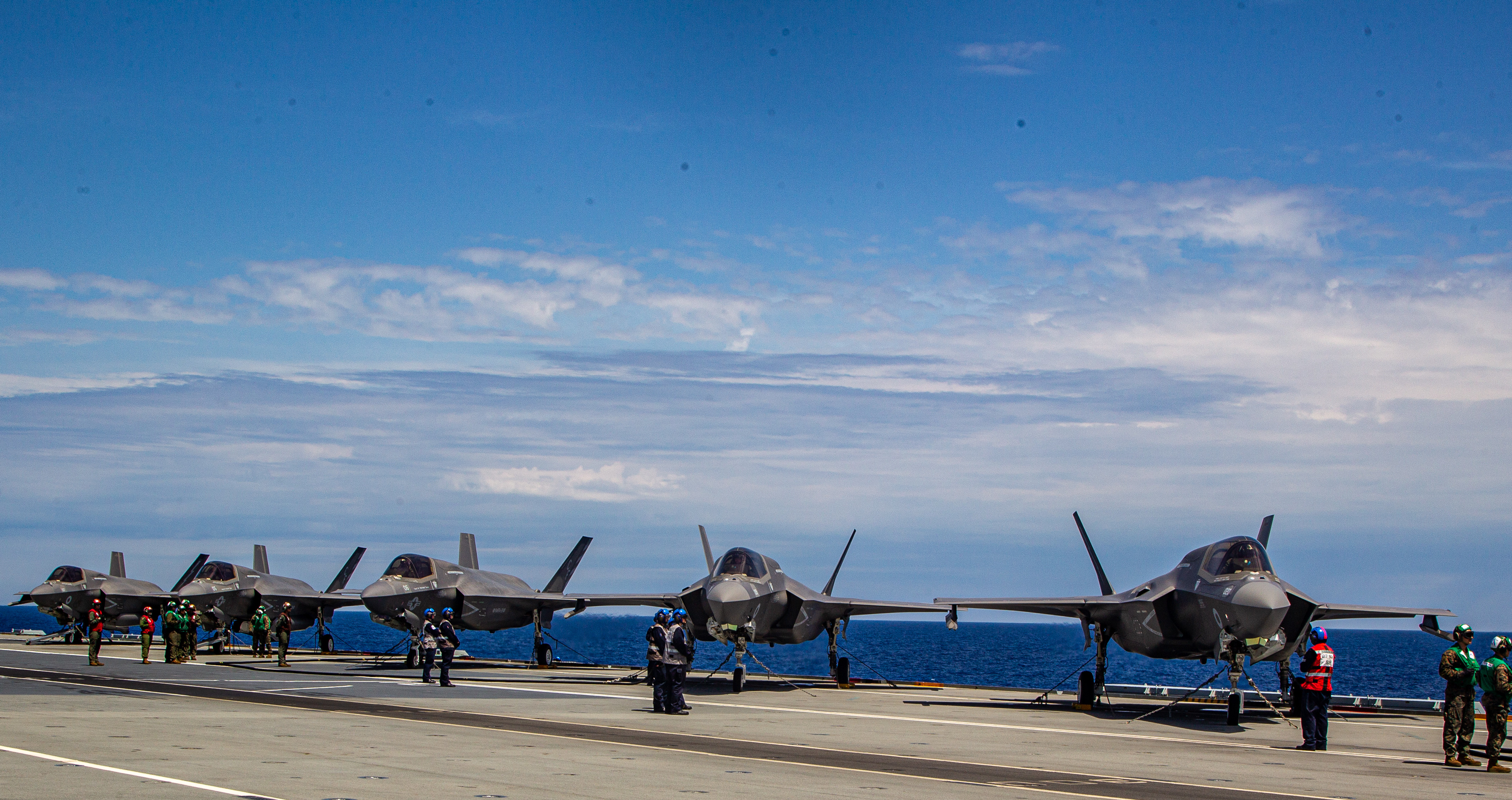 MEDITERRANEAN SEA (June 2, 2021) U.S. Marines with Marine Fighter Attack Squadron (VMFA) 211 and Royal Air Force and Royal Navy personnel with the United Kingdom 617 Squadron complete startup checklists for F-35B Lightning IIs aboard the Royal Navy aircraft carrier HMS Queen Elizabeth (R 08) before training missions with the French navy (Marine Nationale) Charles de Gaulle Carrier Strike Group. VMFA-211 is deployed aboard Queen Elizabeth as part of the United Kingdom�s Carrier Strike Group (CSG) 21. CSG21�s transit of the Mediterranean Sea provides an opportunity to train and exercise with our NATO Allies and regional partners. (U.S. Marine Corps photo by 1st Lt. Zachary Bodner)