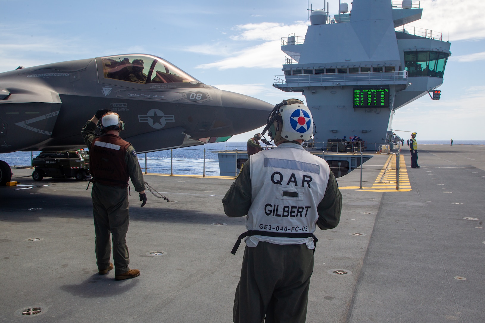 MEDITERRANEAN SEA (June 2, 2021) Gunnery Sgt. Jacob Gilbert with Marine Fighter Attack Squadron (VMFA) 211 supervises a startup checklist of an F-35B Lightning II aboard the Royal Navy aircraft carrier HMS Queen Elizabeth (R 08) before training missions with the French navy (Marine Nationale) Charles de Gaulle Carrier Strike Group. VMFA-211 is deployed aboard HMS Queen Elizabeth as part of the United Kingdom�s Carrier Strike Group (CSG) 21. CSG21�s transit of the Mediterranean Sea provides an opportunity to train and exercise with our NATO Allies and regional partners. (U.S. Marine Corps photo by 1st Lt. Zachary Bodner)