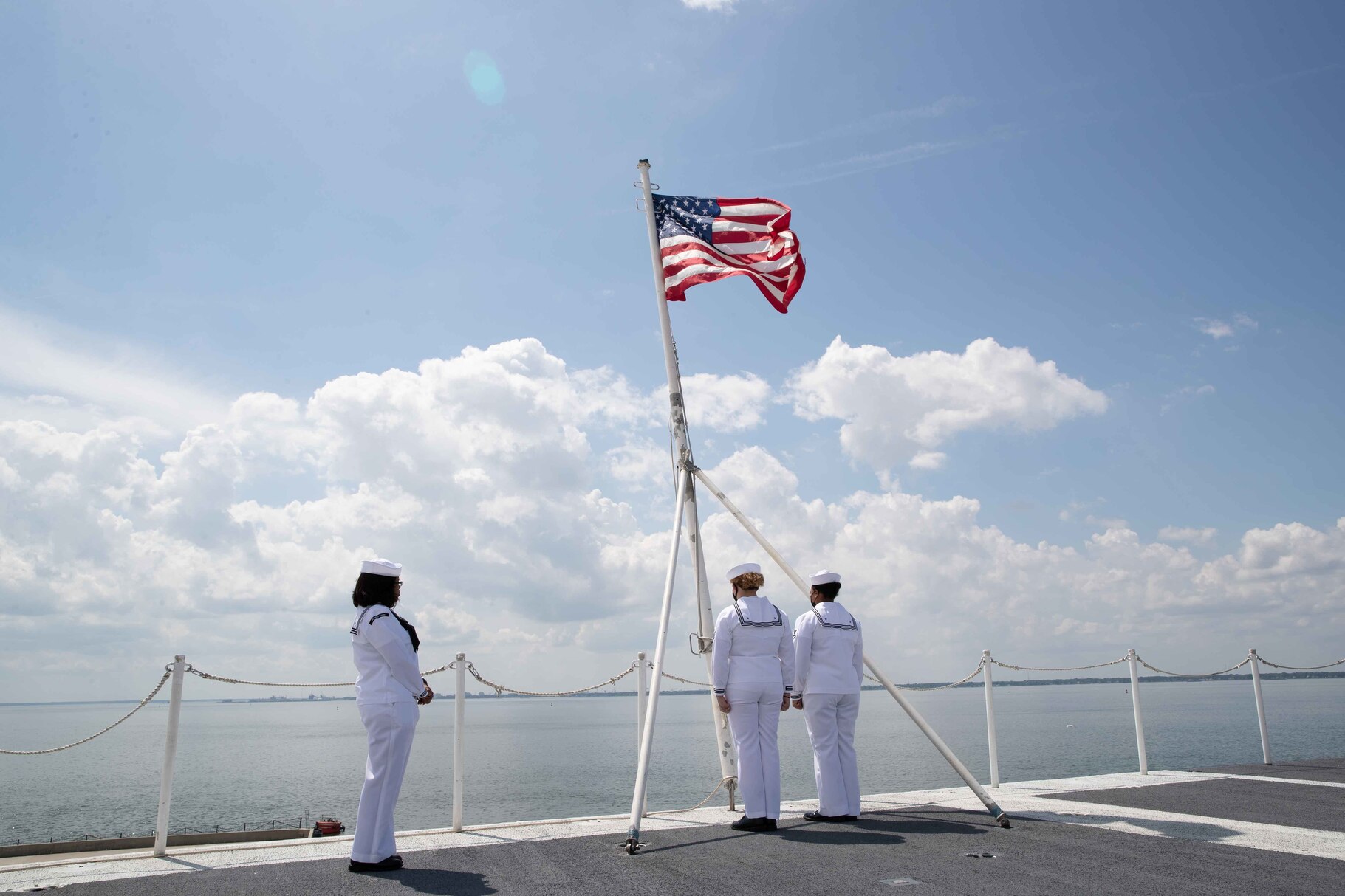 NORFOLK (June 7, 2021) Sailors assigned to the aircraft carrier USS Gerald R. Ford (CVN 78) prepare to lower the national ensign prior to getting underway for full ship shock trials, June 7, 2021. The U.S. Navy conducts shock trials on new ship designs using live explosives to confirm that our warships can continue to meet demanding mission requirements under the harsh conditions they might encounter in battle. (U.S. Navy photo by Mass Communication Specialist Seaman Trenton Edly)