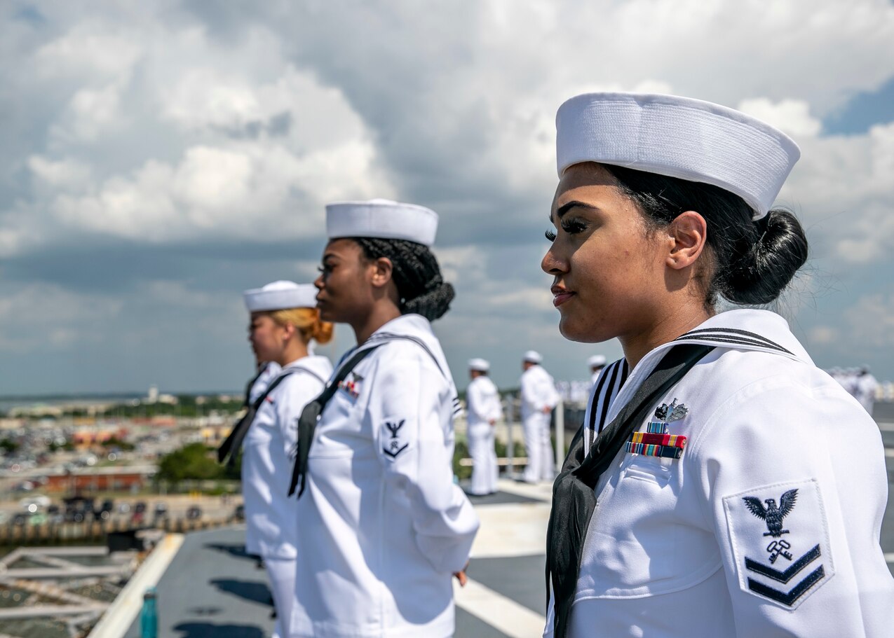 NORFOLK (June 7, 2021) Sailors assigned to the aircraft carrier USS Gerald R. Ford (CVN 78) man the rails as they depart Naval Station Norfolk in honor of the 79th anniversary of the Battle of Midway, June 7, 2021. The battle of Midway, June 4-7, 1942, was an epic clash between the U.S. Navy and the imperial Japanese Navy, where the Navy's decisive victory effectively turned the tide of World War II in the Pacific. The ship is departing Norfolk in preparation for Full Ship Shock Trials. The U.S. Navy conducts shock trials of new ship designs using live explosives to confirm that our warships can continue to meet demanding mission requirements under the harsh conditions they might encounter in battle. (U.S. Navy photo by Mass Communication Specialist 2nd Class Kallysta Castillo)