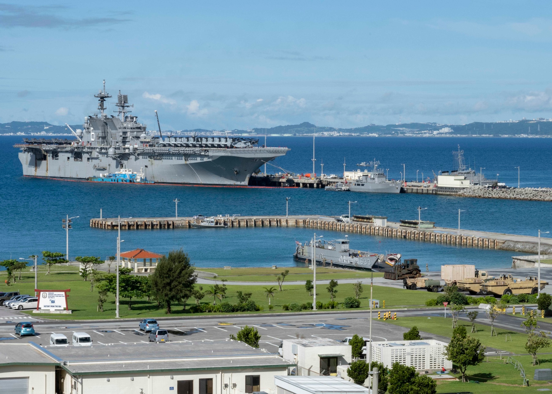 WHITE BEACH, Japan (June 10, 2021) The America-class amphibious assault ship USS America (LHA 6) is moored pier side at Commander, Fleet Activities Okinawa White Beach Naval Facility, Okinawa, Japan, June 10, 2021. In the foreground Naval Beach Unit 7 personnel on load III Marine Expeditionary Force vehicles onto a landing craft utility in the small boat basin. (U.S. Navy photo by Mass Communication Specialist 1st Class David R. Krigbaum)