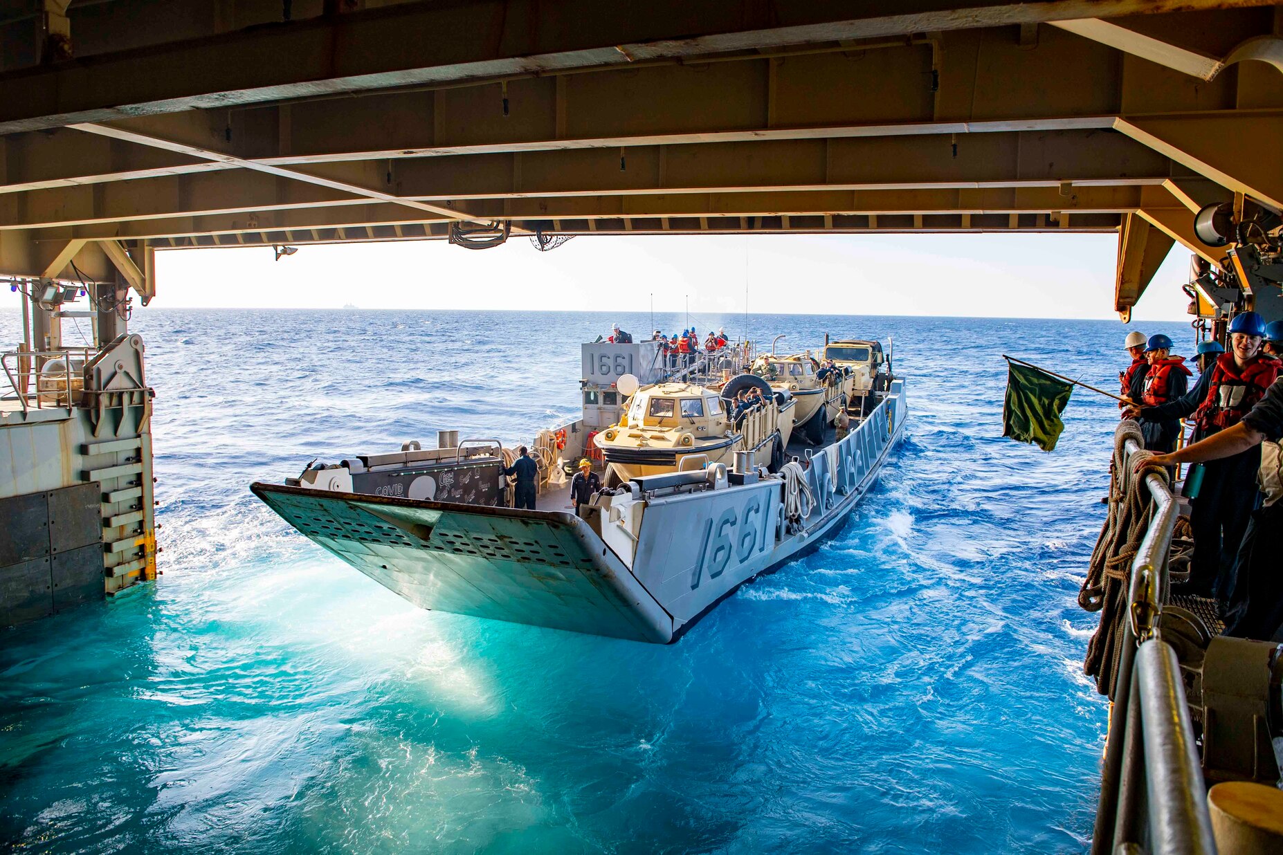 RED SEA (June 20, 2021) Landing Craft, Utility (LCU) 1661, attached to Assault Craft Unit (ACU) 2, departs the well deck of the Harpers Ferry-class dock landing ship USS Carter Hall (LSD 50), June 21, 2021. ACU 2 is deployed with Carter Hall to the U.S. 5th Fleet area of operations in support of naval operations to ensure maritime stability and security in the Central Region, connecting the Mediterranean and Pacific through the western Indian Ocean and three strategic choke points. (U.S. Navy photo by Mass Communication Specialist Seaman Sawyer Connally)