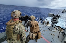 NAVAL BASE GUAM (June 23, 2021) Marines with 4th Marines, 3rd Marine Division conduct a crew-served weapons qualification course during patrol craft integration training at Naval Base Guam, June 23, 2021. The Marines deployed as part of a MKVI Patrol Boat integration program with Maritime Expeditionary Squadron (MSRON) 2 and MSRON 4. MKVI Patrol Boats provide a low-signature platform equipped with an array of weapons and communication systems capable of operating in littoral environments. (U.S. Navy photo Lt. Cmdr. Marvin Jones)