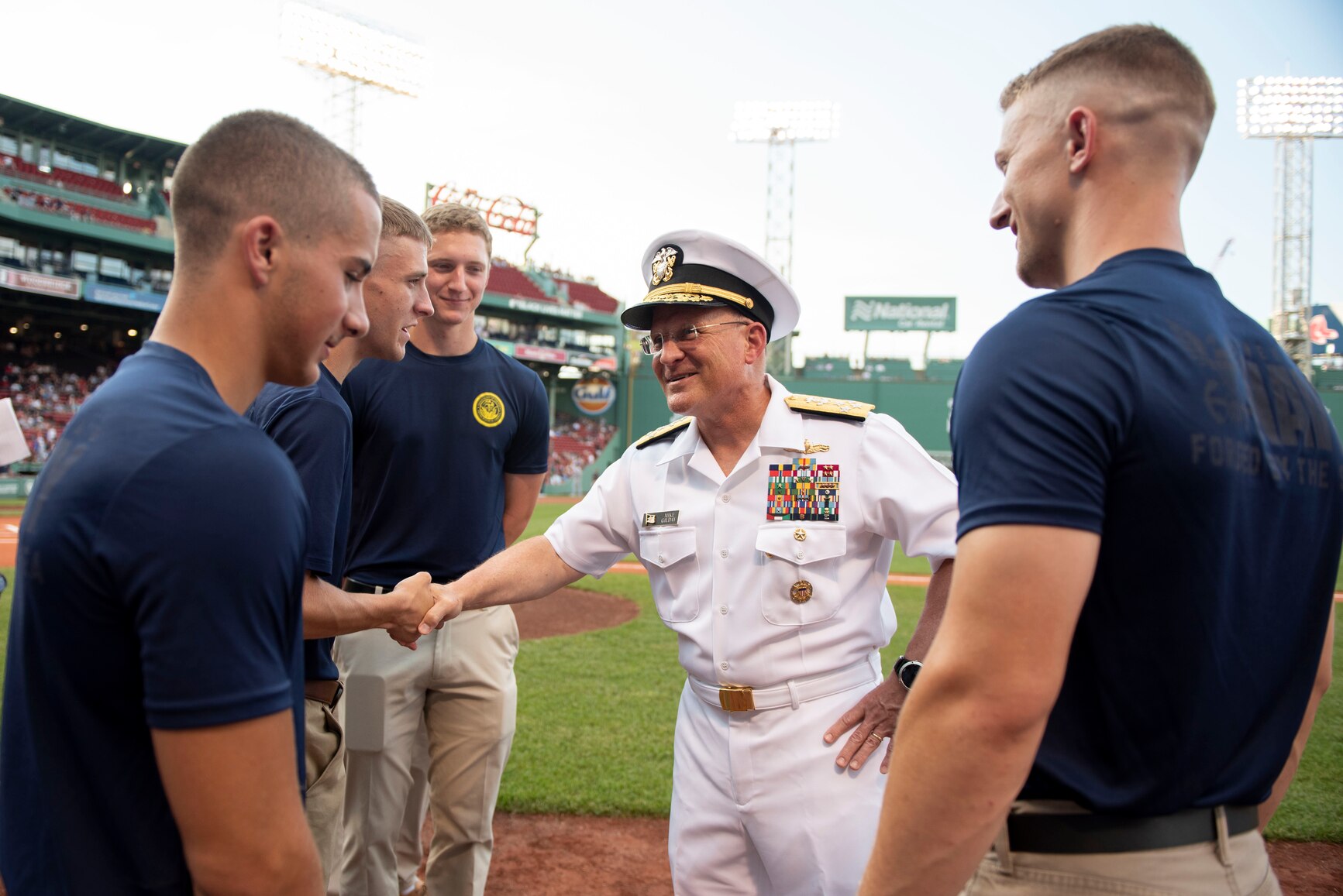 BOSTON (June 29, 2021) Chief of Naval Operations Adm. Mike Gilday congratulates newly-enlisted Navy Sailors prior to a Red Sox baseball game at Fenway Park, Boston. Prior to the game, CNO administered the oath of enlistment to future U.S. Navy Sailors, Strike Fighter Squadron 213 (VFA-213) the Blacklions conducted a fly over, a Navy Band D.C. vocalist sang the national anthem, and the USS Constitution color guard paraded the colors in front of the audience. (U.S. Navy Photo by Mass Communication Specialist 1st Class Raymond D. Diaz III)