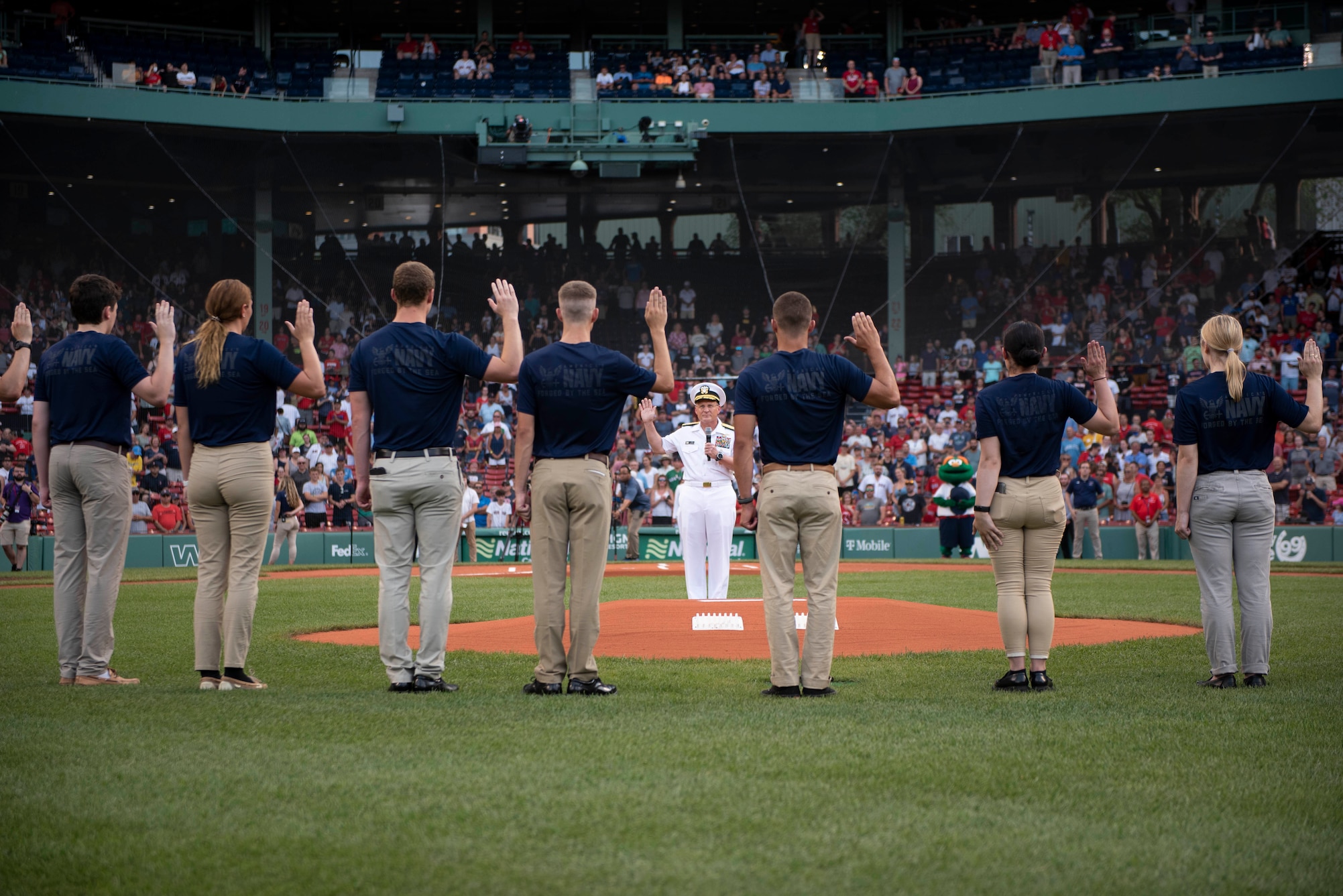 BOSTON (June 30, 2021) Chief of Naval Operations Adm. Mike Gilday administers the oath of enlistment to future U.S. Navy Sailors prior to a Red Sox baseball game at Fenway Park, Boston. The celebration of military service included Strike Fighter Squadron 213 (VFA-213) the Blacklions conducted a fly over, a Navy Band D.C. vocalist sang the national anthem, and the USS Constitution color guard paraded the colors in front of the audience. (U.S. Navy Photo by Mass Communication Specialist 1st Class Raymond D. Diaz III)