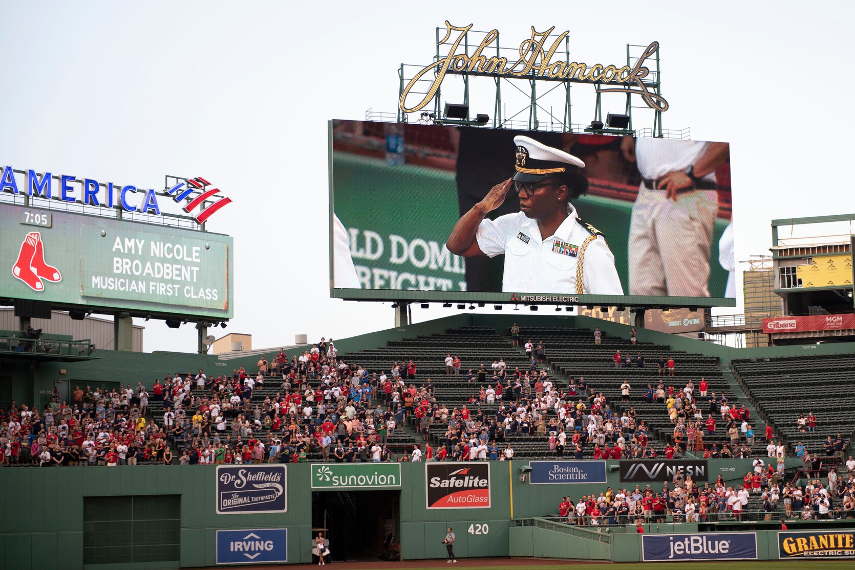 BOSTON (June 29, 2021) Lt. Cmdr. Lauren Cherry, flag aide to Chief of Naval Operations Adm. Mike Gilday, salutes the before a Red Sox baseball game at Fenway Park, Boston. Prior to the game, CNO administered the oath of enlistment to future U.S. Navy Sailors, Strike Fighter Squadron 213 (VFA-213) the Blacklions conducted a fly over, a Navy Band D.C. vocalist sang the national anthem, and the USS Constitution color guard paraded the colors in front of the audience. (U.S. Navy Photo by Mass Communication Specialist 1st Class Raymond D. Diaz III)