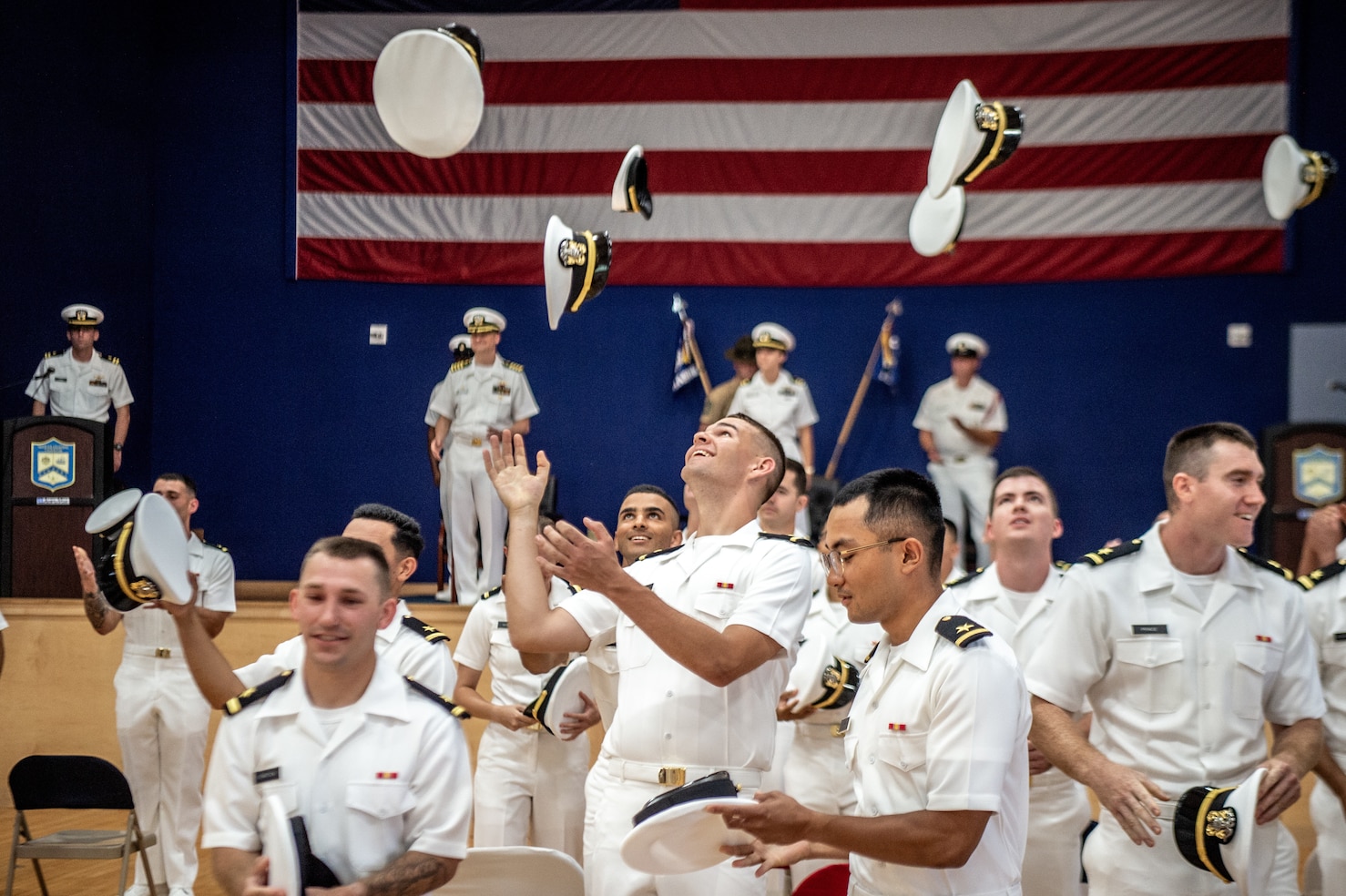NEWPORT, R.I. (July 16, 2021) Officer Candidate School (OCS) class 13-21 students at Officer Training Command Newport (OTCN), Rhode Island, celebrate their graduation. OCS morally, mentally and physically develops civilians and fleet Sailors into newly commissioned officers and imbues them with the highest ideals of honor, courage and commitment for service in the fleet as Naval officers. (U.S. Navy photo by Andrew Morgan)