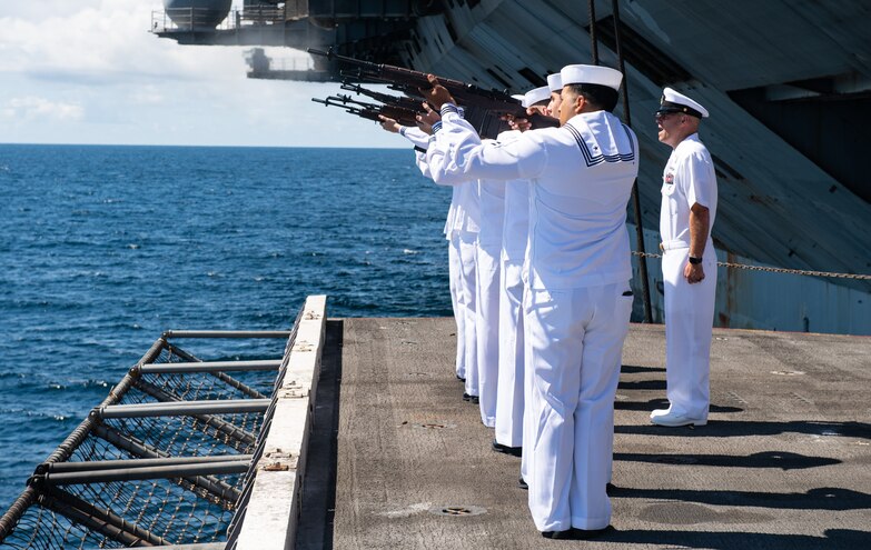 PACIFIC OCEAN (July 21, 2021) U.S. Sailors fire a rifle salute during a burial-at-sea ceremony aboard the aircraft carrier USS Theodore Roosevelt (CVN 71), July 21, 2021. Theodore Roosevelt is conducting a homeport shift from San Diego to Bremerton, Wash. (U.S. Navy photo by Mass Communication Specialist Seaman Hayden J. Burns)