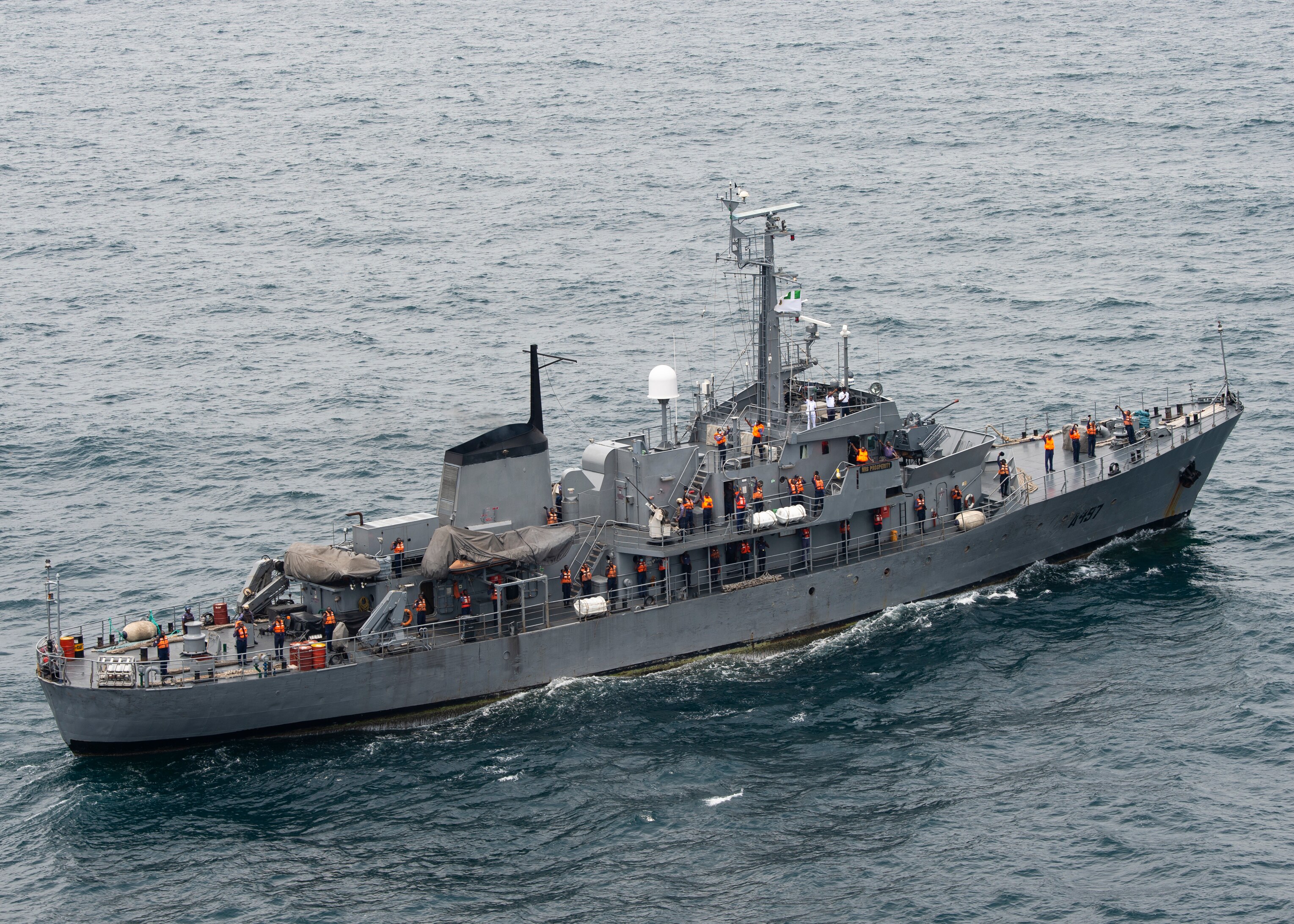 GULF OF GUINEA (Aug. 10, 2021) The crew of the Nigeria navy patrol vessel NNS Prosperity (A497) participates in a ceremonial pass-in-review with the Expeditionary Sea Base USS Hershel "Woody" Williams (ESB 4) man the lines for a ceremonial pass-in-review with ships from the Nigerian navy, Aug. 10, 2021. Hershel "Woody" Williams is conducting a maritime security capability exercise to build on its existing partnership with the Nigerian navy and joint interoperability operations with allies and partners in support of U.S. national interests and security in Africa and the Gulf of Guinea. (U.S. Navy photo by Mass Communication Specialist 3rd Class Malachi Lakey)
