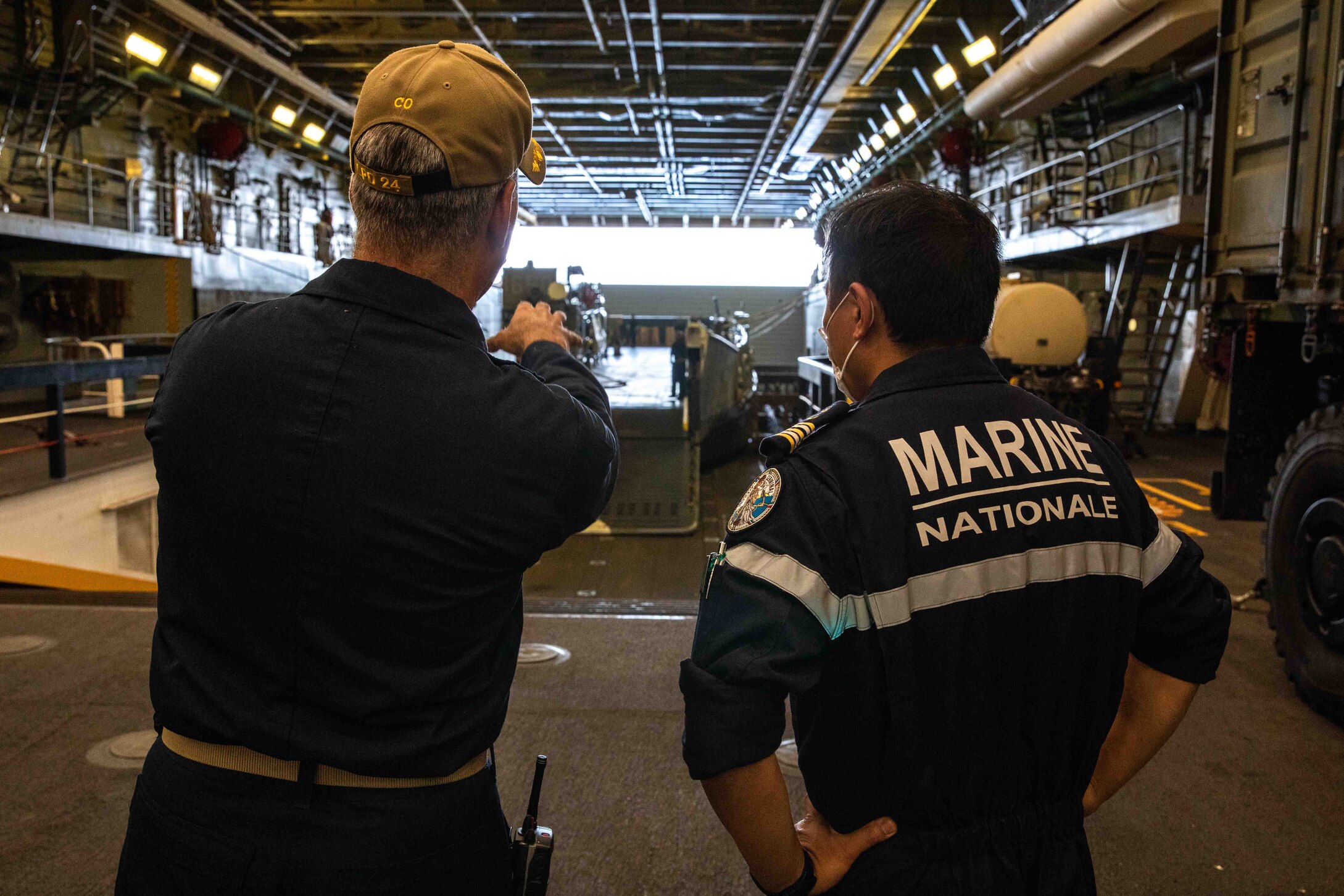\CARIBBEAN SEA (Aug. 24, 2021) Capt. Eric Kellum, left, commanding officer of the San Antonio-class amphibious transport dock ship USS Arlington (LPD 24), explains the ship�s well deck capabilities to French navy frigate Capt. Chun Jen Fang, commandant of the Flor�al-class frigate FS Germinal (F735), Aug. 24, 2021. Fang�s visit enabled leadership to exchange best practices as they work together toward the common goal of supporting the humanitarian relief efforts in Haiti. Arlington is deployed to U.S. Naval Forces Southern Command/U.S. 4th Fleet to support humanitarian assistance and disaster relief (HADR) efforts in Haiti following a 7.2-magnitude earthquake, Aug. 14, 2021. (U.S. Navy photo by Mass Communication Specialist 2nd Class John Bellino)