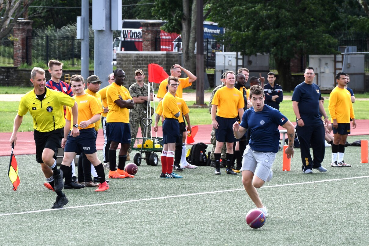 GROTON, Conn. (Sept. 2, 2021) Crew members assigned to the French submarine FNS Amethyste (S605), their host ship USS Cheyenne (SSN 773) and other submarine commands play a friendly soccer match onboard Naval Submarine Base New London in Groton, Connecticut, Sept. 2, 2021. Amethyste’s scheduled good will port visit is the first international submarine visit to Groton since 2018 and allows the crew to experience cultural exchanges with their American counterparts. (U.S. Navy photo by Chief Mass Communication Specialist Joshua Karsten)
