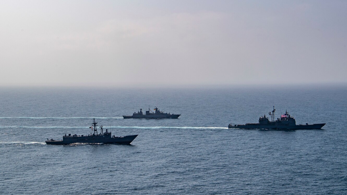 ARABIAN SEA (Sept. 6, 2021) The Pakistan navy frigate PNS Alamgir (F 260), the German navy frigate FGS Bayern (F 217), and the guided-missile cruiser USS Shiloh (CG 67) sail in formation during a passing exercise (PASSEX) in the Arabian Sea. The exercise included advanced maneuvers and communication drills flexing the crews� abilities to operate together in a dynamic environment, and test and refine combined command and control processes. (U.S. Navy photo by Mass Communication Specialist 1st Class Rawad Madanat)
