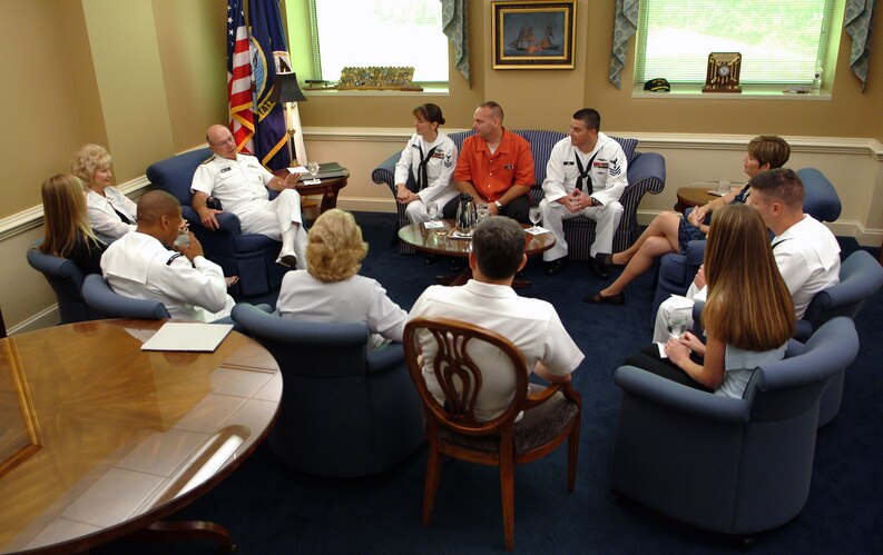 US Navy (USN) Chief of Naval Operations (CNO) Admiral (ADM) Vern Clark and Mrs. Connie Clark spend time with the Pacific, Atlantic, Shore, and Reserve Force Sailors of the Year the day prior to their promotion to Chief Petty Officer. They were escorted by Master Chief Petty Officer of the Navy (MCPON) Terry Scott and his wife Mrs. Doreen Scott.