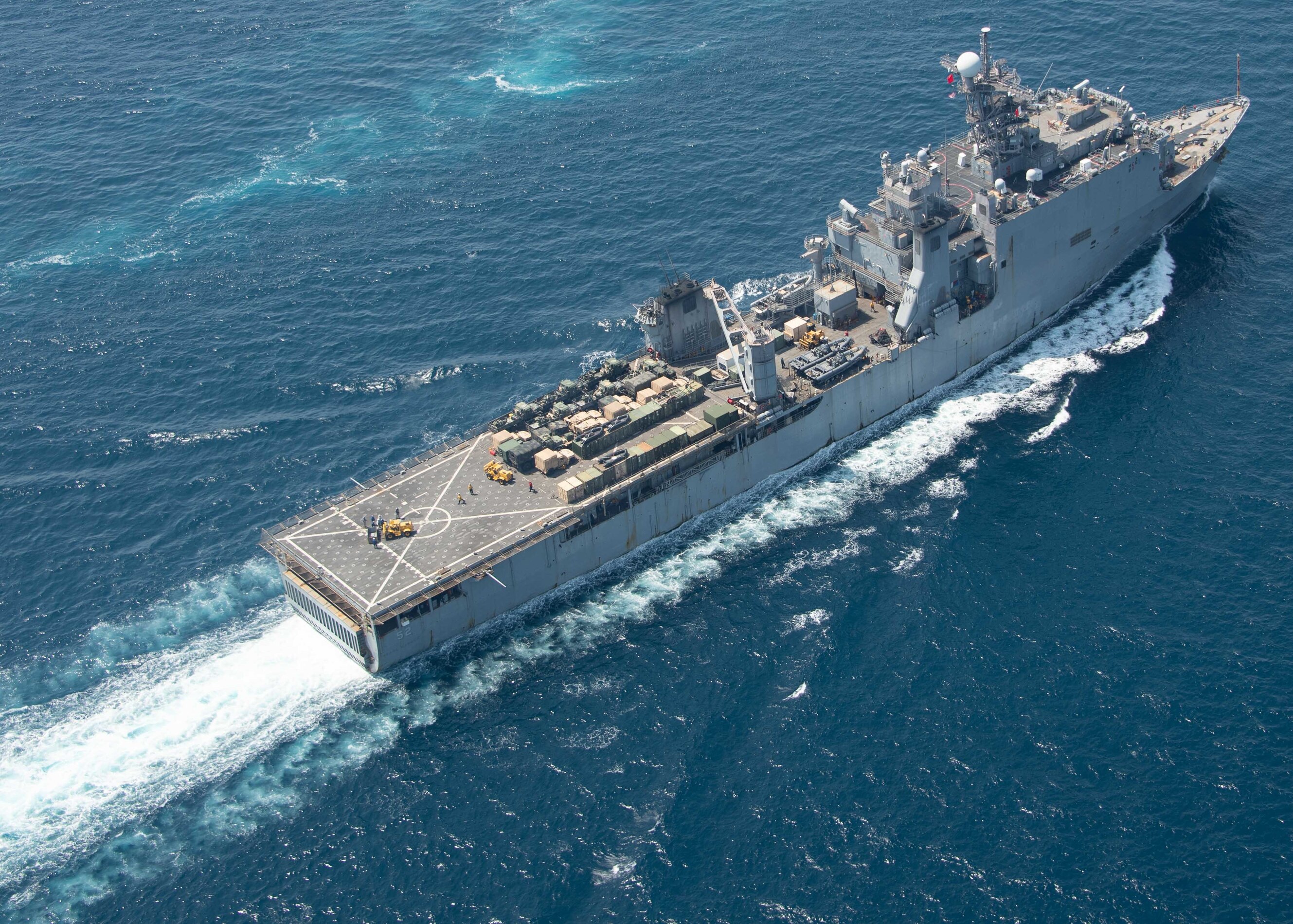 ARABIAN GULF (Sept. 18, 2021) The amphibious dock landing ship USS Pearl Harbor (LSD 52) transits the Arabian Gulf, Sept. 18, 2021. Essex and the 11th Marine Expeditionary Unit are deployed to the U.S. 5th Fleet area of operations in support of naval operations to ensure maritime stability and security in the Central Region, connecting the Mediterranean and the Pacific through the western Indian Ocean and three strategic choke points. (U.S. Navy photo by Mass Communication Specialist 2nd Class Wesley Richardson)