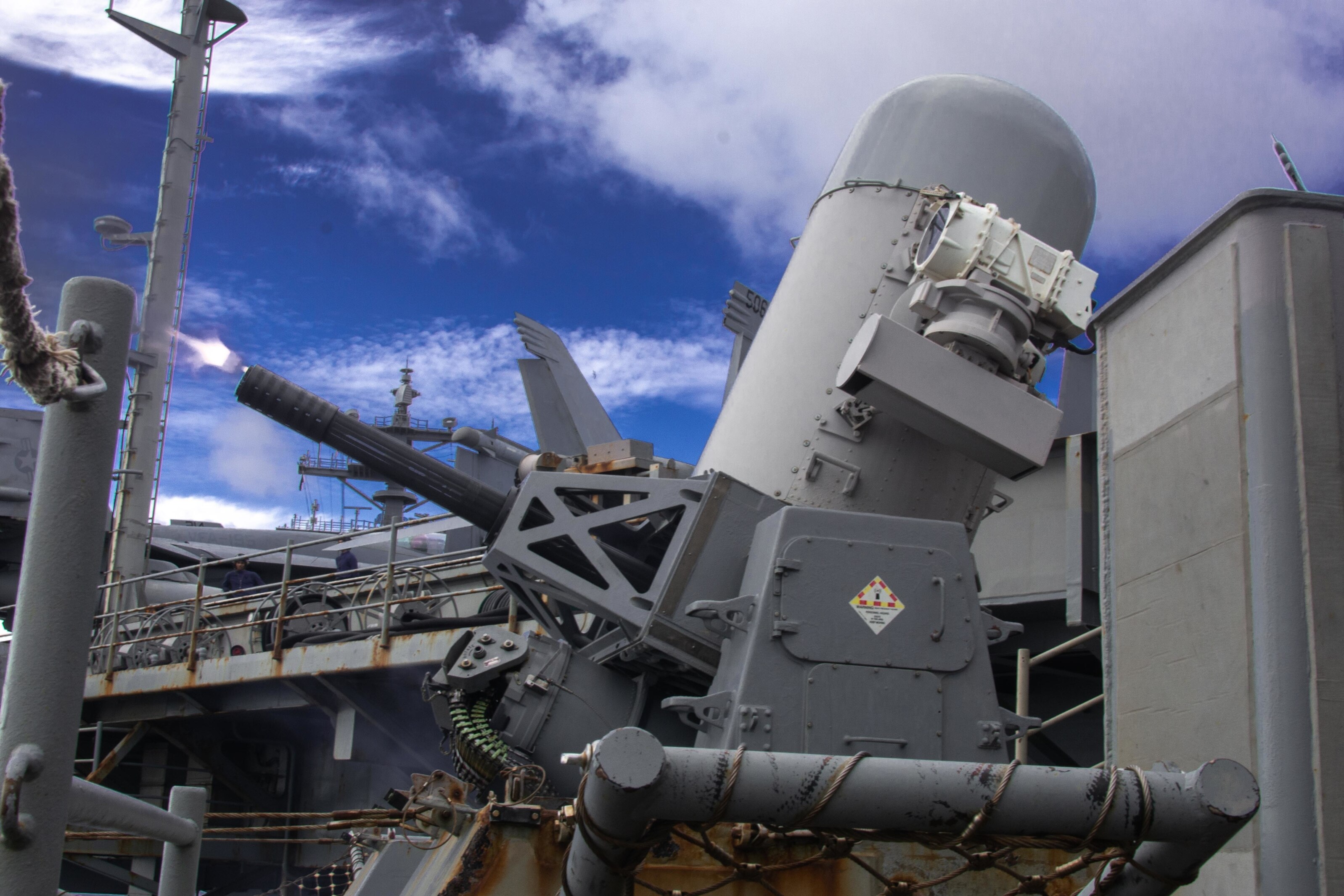 INDIAN OCEAN (Sept. 19, 2021) A MK15 Phalanx close-in weapons system (CIWS) fires during a live-fire exercise from the U.S. Navy�s only forward-deployed aircraft carrier USS Ronald Reagan (CVN 76). Ronald Reagan, the flagship of Carrier Strike Group 5, provides a combat-ready force that protects and defends the United States, and supports alliances, partnerships and collective maritime interests in the Indo-Pacific region. (U.S. Navy photo by Mass Communication Specialist Seaman George Cardenas)