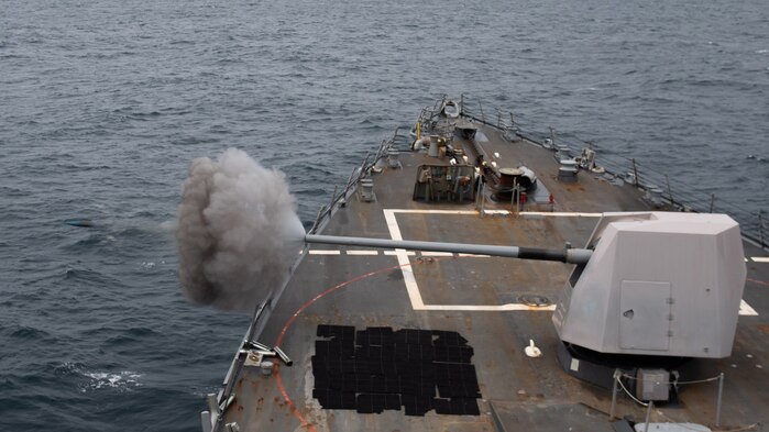 PACIFIC OCEAN (Sept. 18, 2021) The Arleigh Burke-class guided-missile destroyer USS Mustin (DDG 89) fires its 5-inch gun while underway in the Pacific Ocean, Sept. 18, 2021. Mustin is currently underway in the U.S. 4th Fleet area of responsibility conducting a series of exercises designed to increase interoperability and build capacity among partner nations. (U.S. Navy photo by Mass Communication Specialist 2nd Class James S. Hong)