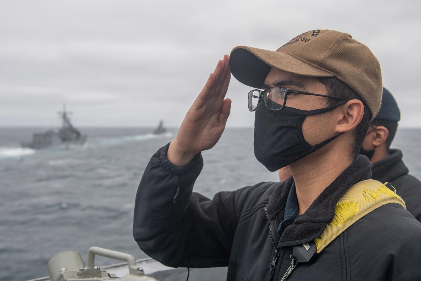 PACIFIC OCEAN (Sept. 17, 2021) Lt. j.g. Johnny Santiago, from Pflugerville, Texas, salutes Chilean navy ships from the starboard bridge wing aboard the Arleigh Burke-class guided-missile destroyer USS Mustin (DDG 89) during exercise Teamwork South, Sept. 17, 2021. Teamwork South is a biennial Chilean naval exercise that focuses on conducting training scenarios in intermediate and advanced anti-surface and anti-submarine warfare operations. (U.S. Navy photo by Mass Communication Specialist 2nd Class James S. Hong)