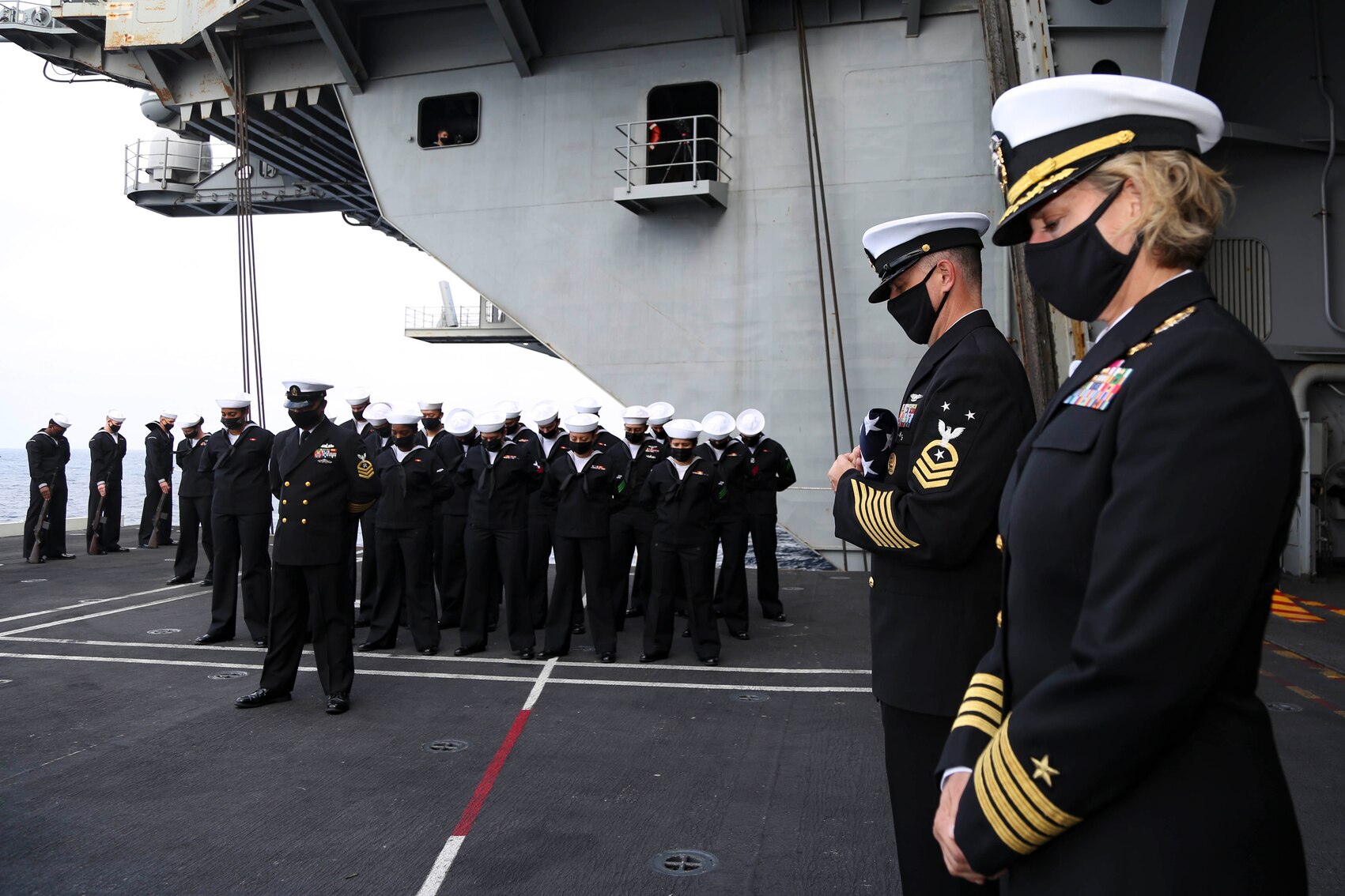 PACIFIC OCEAN (Aug. 28, 2021) Capt. Amy Bauernschmidt, right, commanding officer of the aircraft carrier USS Abraham Lincoln (CVN 72), and Command Master Chief Brian Happli, senior enlisted leader of Abraham Lincoln, bow their heads in prayer during a burial-at-sea ceremony. Abraham Lincoln is underway conducting routine operations in the U.S. 3rd Fleet area of operations. (U.S. Navy photo by Mass Communication Specialist Seaman Apprentice Julia Brockman)