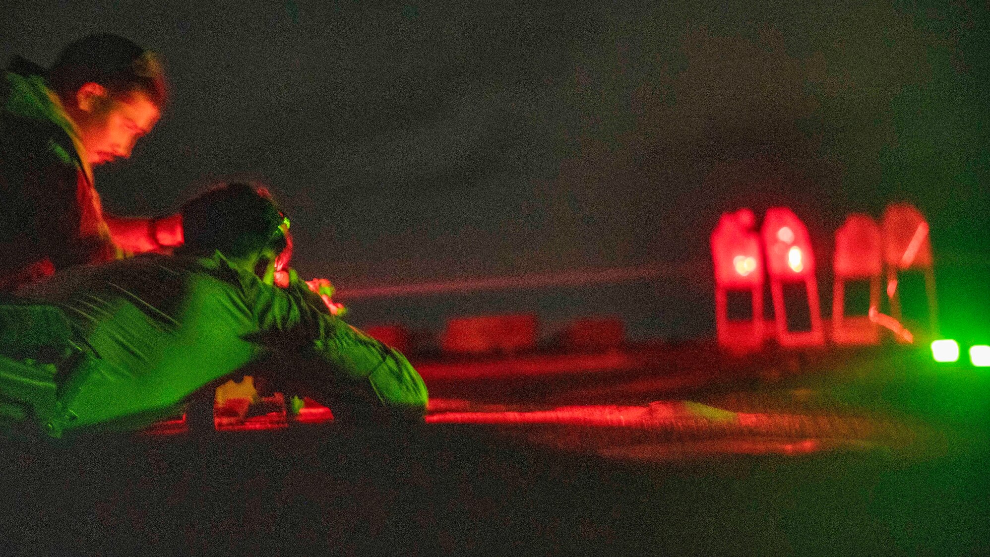 PACIFIC OCEAN (Sept. 11, 2021) A corpsman with the All Domain Reconnaissance Detachment, 11th Marine Expeditionary Unit, sights in with an M4A1 carbine during a night-time live-fire range aboard the amphibious dock landing ship USS Pearl Harbor (LSD 52), Sept. 10, 2021. Pearl Harbor, part of the USS Essex Amphibious Ready Group, along with the 11th MEU, is operating in the U.S. 7th Fleet area of responsibility to enhance interoperability with allies and partners and serve as a ready response force to defend peace and stability in the Indo-Pacific region. (U.S. Marine Corps photo by Sgt. Jaxson Fryar)