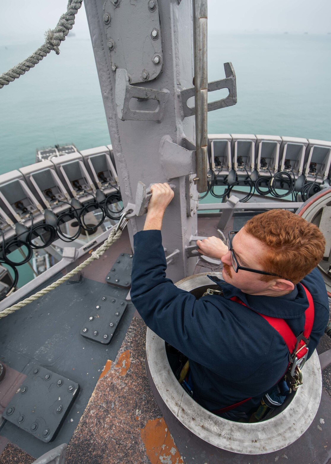 LIMA, Peru (Sept. 24, 2021) Electronics Technician 2nd Class Ian Goodson, from Phoenix, ascends to the top of the mast aboard the Arleigh Burke-class guided-missile destroyer USS Mustin (DDG 89) to inspect antennas while anchored off the coast of Lima, Peru for UNITAS LXII, Sept. 24, 2021. UNITAS is the world's longest-running, maritime exercise. Hosted this year by Peru, it brings together multinational forces from nineteen countries and includes 29 ships, four submarines, and twenty aircraft conducting operations off the coast of Lima and in the jungles of Iquitos. The exercise trains forces to conduct joint maritime operations and focuses on strengthening partnerships and increasing interoperability and capability between participating naval and marine forces. (U.S. Navy Photo by Mass Communication Specialist 2nd Class James S. Hong)
