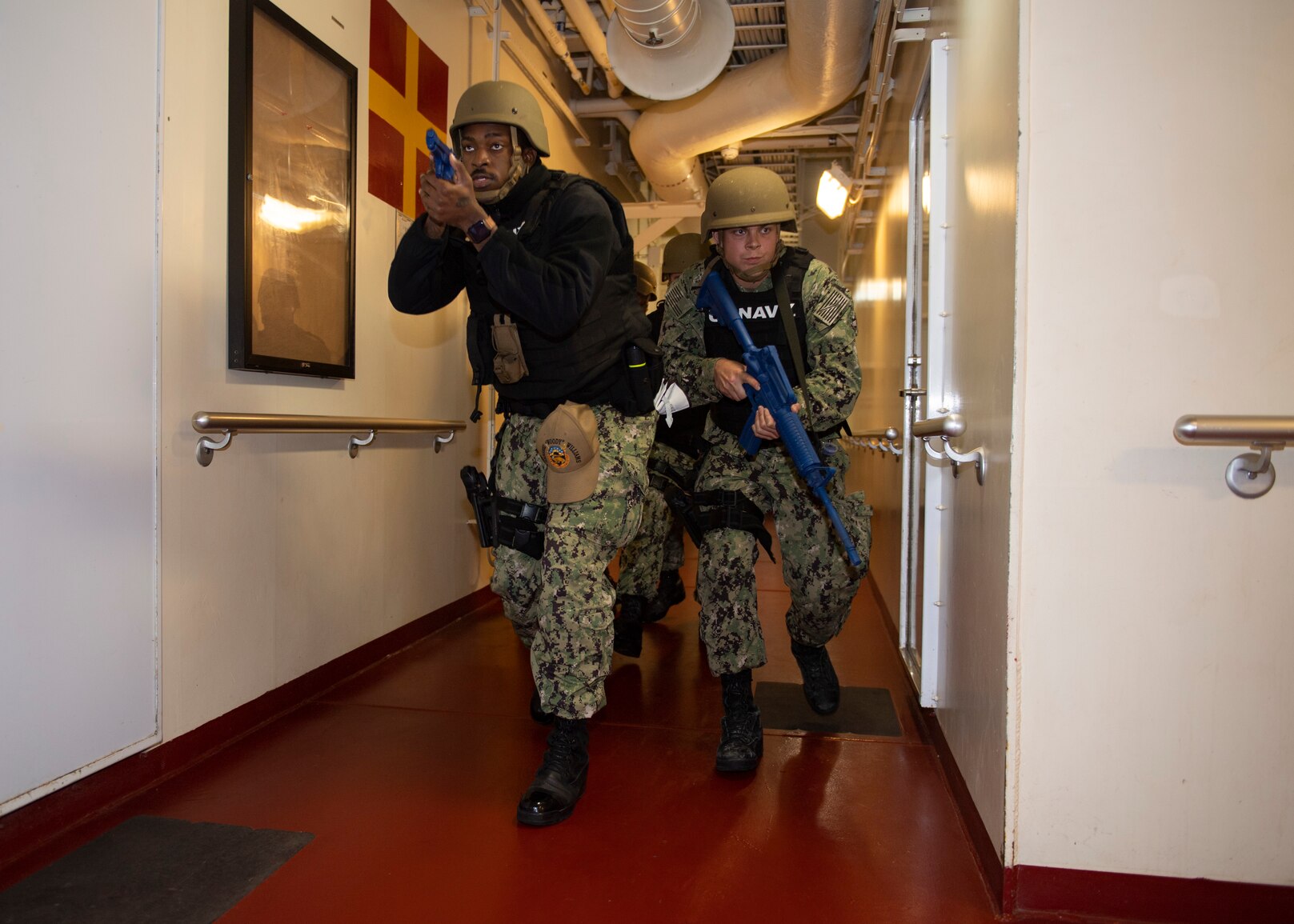 CAPE TOWN, South Africa (Sept. 25, 2021) Aviation Boatswain's Mate (Handling) Airman Talon T. Ross, left, and Seaman Apprentice Ethan J. Dowden participate in tactical team movement exercises during a Ship's Reactionary Force Basic course aboard the expeditionary sea base USS Hershel "Woody" Williams (ESB 4), Sept. 25, 2021. Hershel "Woody" Williams is on a scheduled deployment in the U.S. 6th Fleet area of operations in support of U.S. national security interests in Europe and Africa. (U.S. Navy photo by Mass Communication Specialist 3rd Class Malachi Lakey)