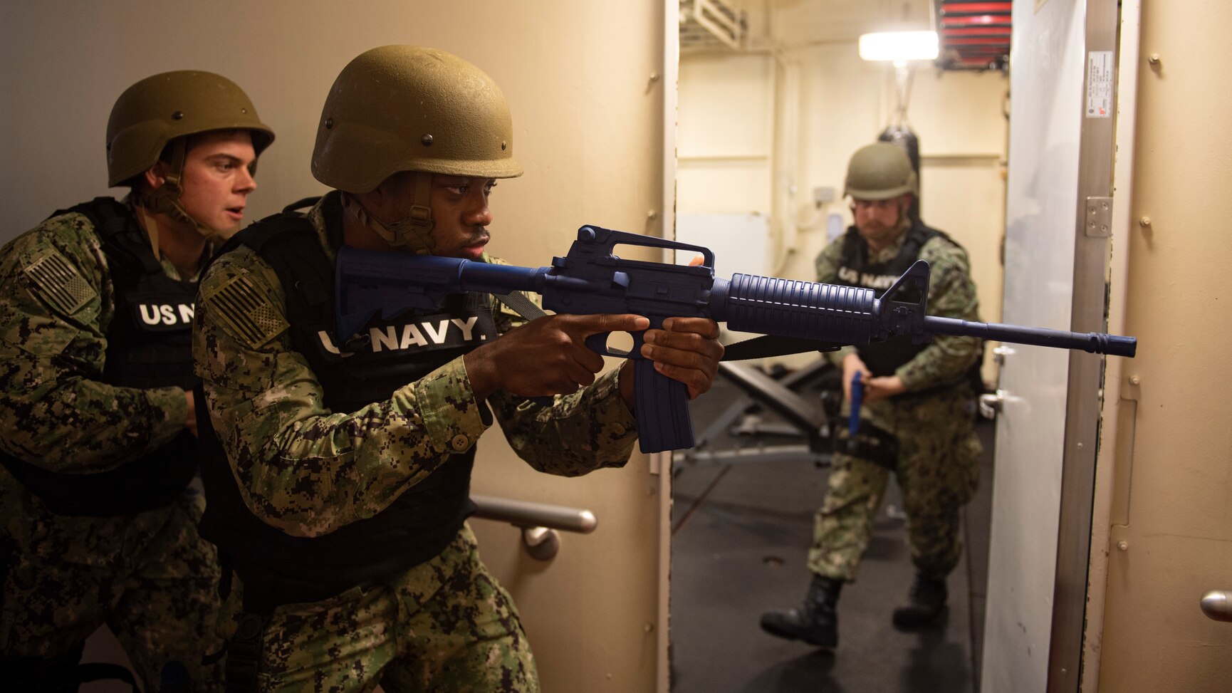 CAPE TOWN, South Africa (Sept. 25, 2021) Seaman Apprentice Ethan J. Dowden, left, Aviation Boatswain's Mate (Handling) Airman Recruit Christopher Hopkins and Seaman Jacob A. Chalmers participate in tactical team movement exercises during a Ship's Reaction Force Basic course aboard the expeditionary sea base USS Hershel "Woody" Williams (ESB 4), Sept. 25, 2021. Hershel "Woody" Williams is on a scheduled deployment in the U.S. national security interests in Europe and Africa. (U.S. Navy photo by Mass Communication Specialist 3rd Class Malachi Lakey)