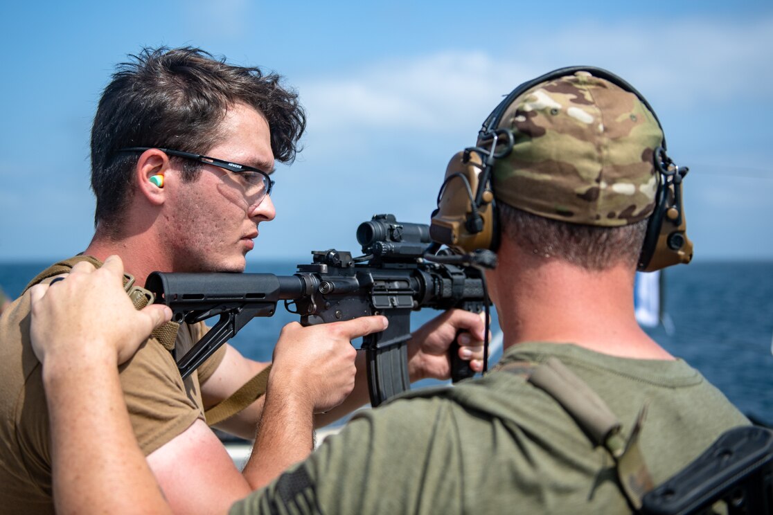 ARABIAN SEA (Sept. 25, 2021) Fire Controlman 2nd Class Colby Weir, left, receives instruction on shooting an MK 18 during a weapons familiarization course aboard guided-missile destroyer USS O�Kane (DDG 77) in the Arabian Sea. O�Kane is deployed to the U.S. 5th Fleet area of operations in support of naval operations to ensure maritime stability and security in the Central Region, connecting the Mediterranean Sea and Pacific Ocean through the western Indian Ocean and three strategic choke points. (U.S. Navy photo by Mass Communication Specialist Seaman Elisha Smith)