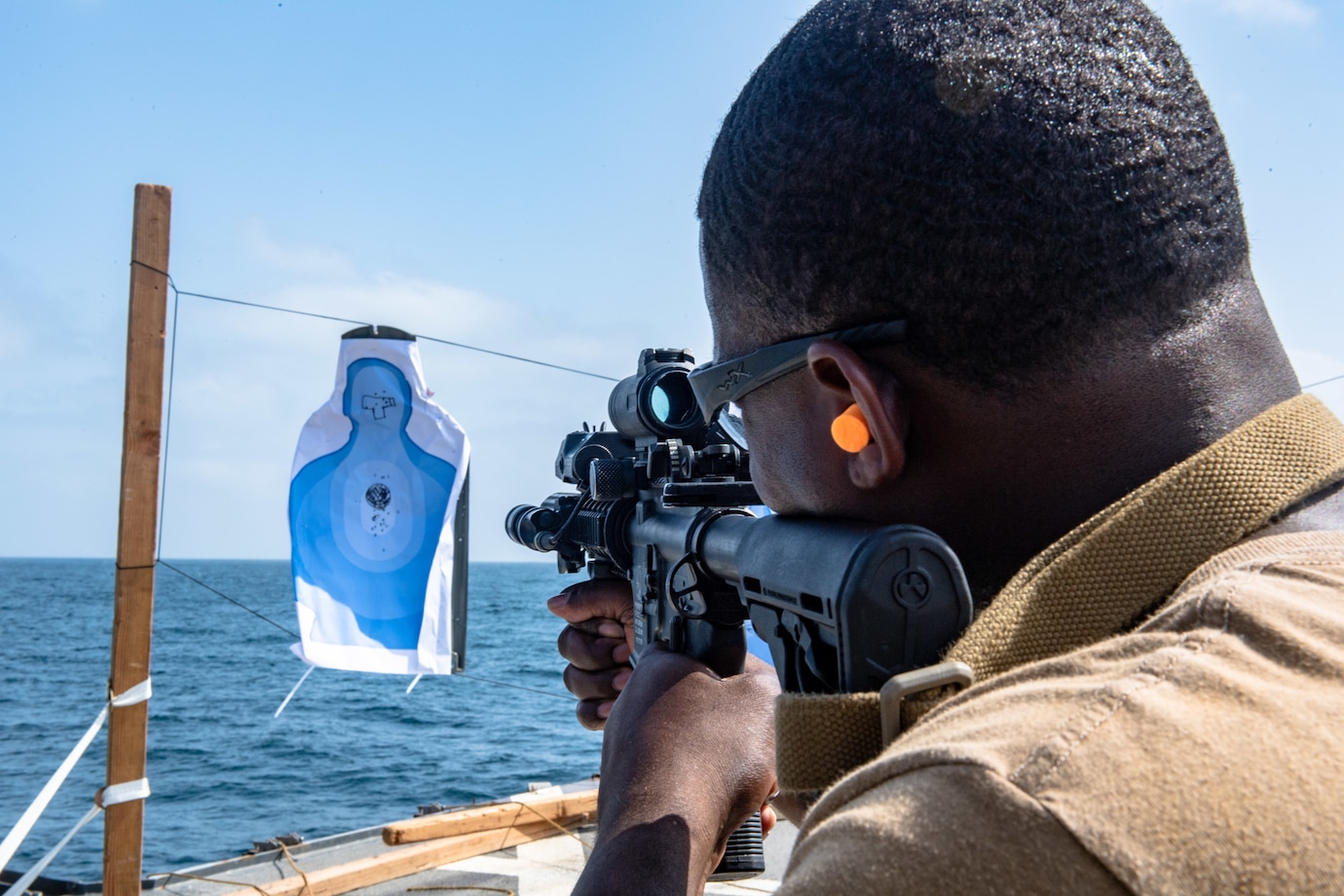ARABIAN SEA (Sept. 25, 2021) Operation Specialist 1st Class Joshua Bradley shoots an MK 18 during a weapons familiarization course aboard guided-missile destroyer USS O�Kane (DDG 77) in the Arabian Sea. O�Kane is deployed to the U.S. 5th Fleet area of operations in support of naval operations to ensure maritime stability and security in the Central Region, connecting the Mediterranean Sea and Pacific Ocean through the western Indian Ocean and three strategic choke points. (U.S. Navy photo by Mass Communication Specialist Seaman Elisha Smith)