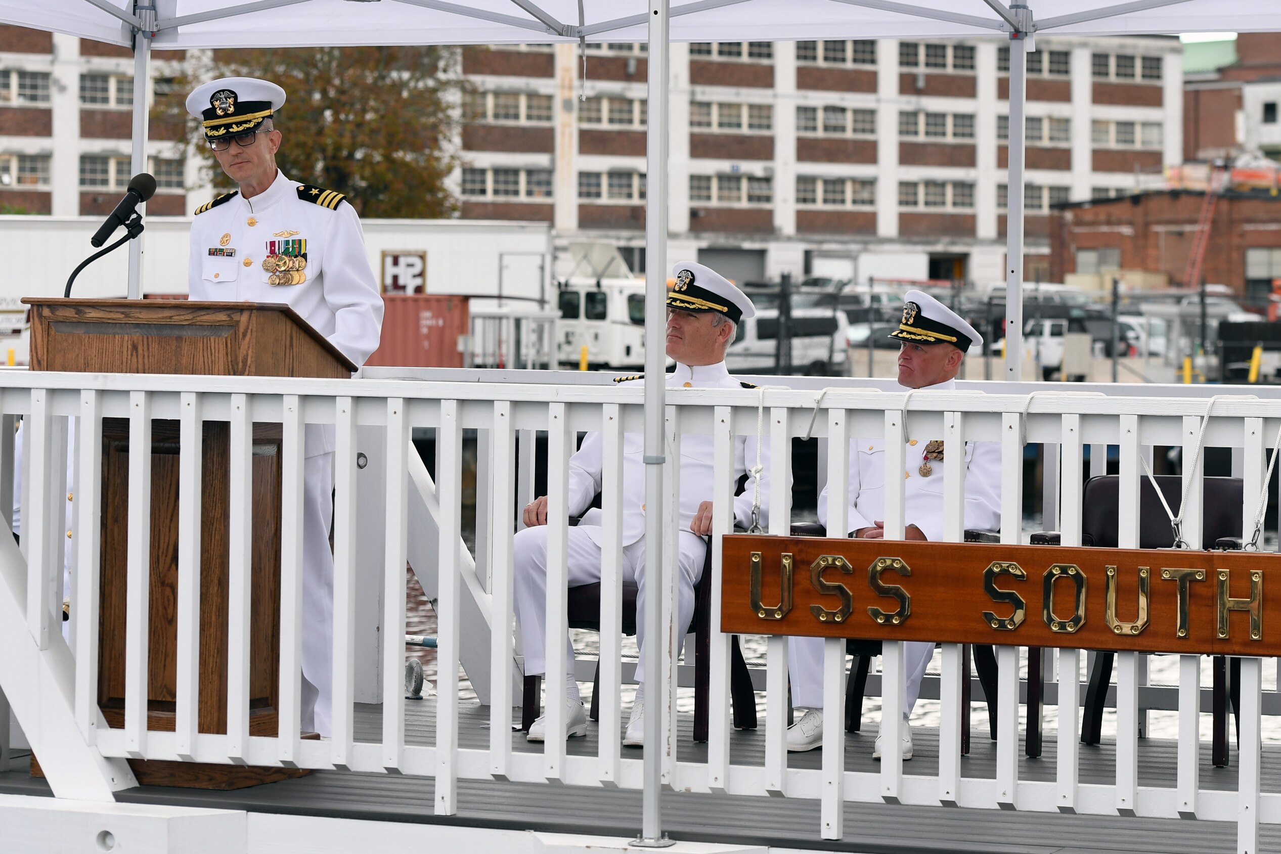 GROTON, Conn. (Sept. 27, 2021) Cmdr. Adam Zaker, incoming commanding officer the Virginia-class submarine USS South Dakota (SSN 790), delivers remarks during a change-of-command ceremony for onboard Naval Submarine Base New London in Groton, Conn. South Dakota and crew operate under Submarine Squadron (SUBRON) FOUR and its primary mission is to provide fast-attack submarines that are ready, willing, and able to meet the unique challenges of undersea combat and deployed operations in unforgiving environments across the globe. (U.S. Navy photo by Chief Mass Communication Specialist Joshua Karsten)