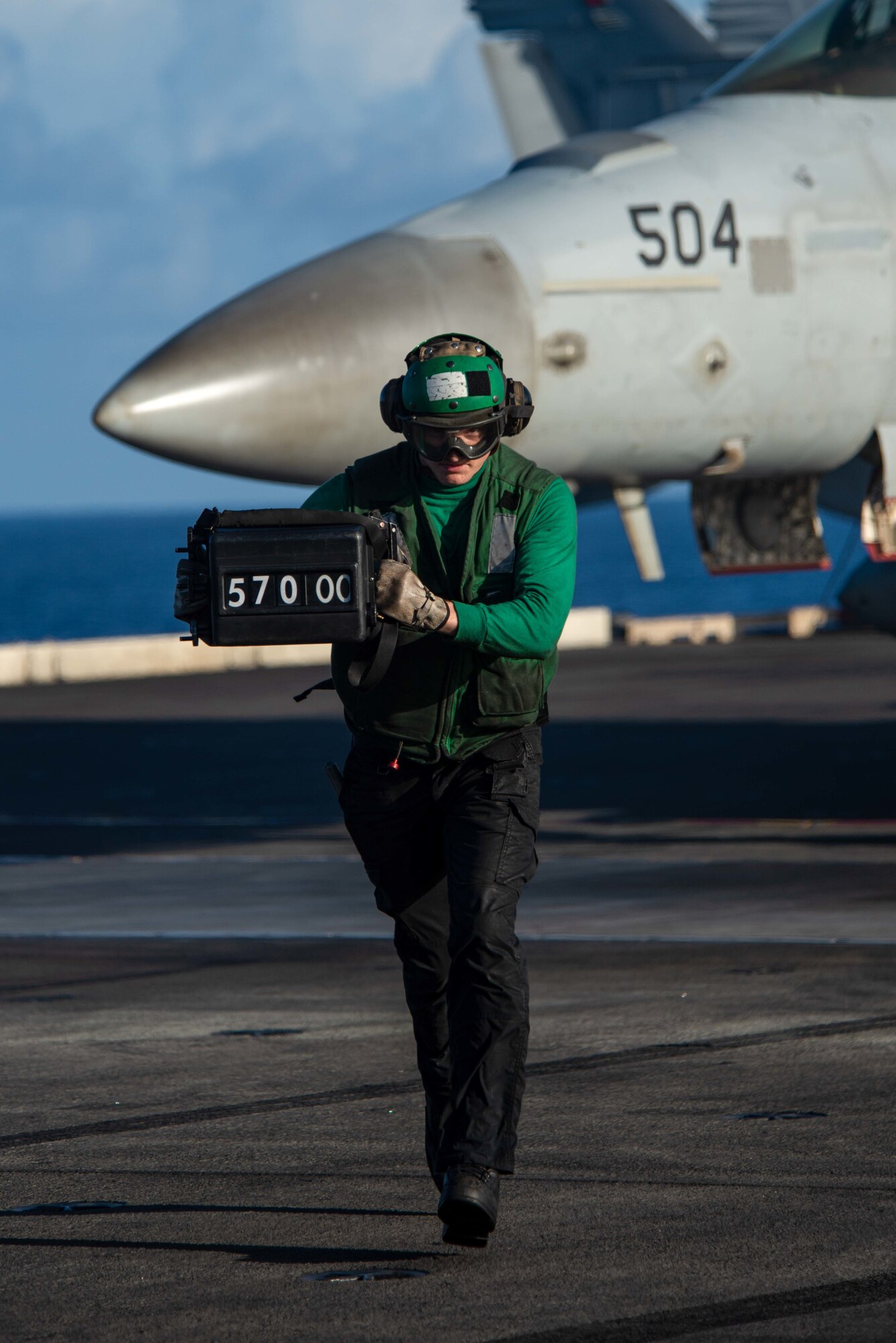 PHILIPPINE SEA (Sept. 28, 2021) Airman Apprentice Adam Dangel, from Reno, Nevada, reports the weight of an EA-18G Growler, attached to the �Shadowhawks� of Electronic Attack Squadron (VAQ) 141, on the flight deck of the U.S. Navy�s only forward-deployed aircraft carrier USS Ronald Reagan (CVN 76). Ronald Reagan, the flagship of Carrier Strike Group 5, provides a combat-ready force that protects and defends the United States, and supports alliances, partnerships and collective maritime interests in the Indo-Pacific region. (U.S. Navy photo by Mass Communication Specialist 3rd Class Gray Gibson)