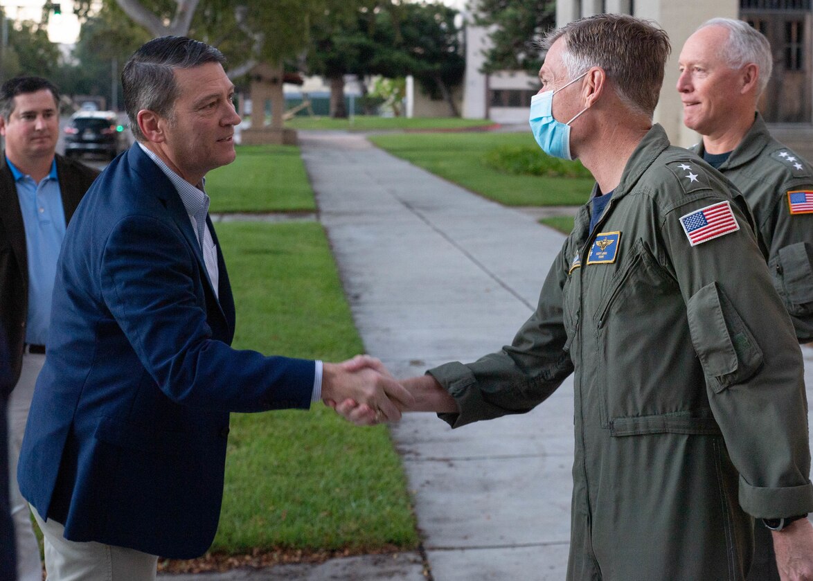 SAN DIEGO (Oct. 15, 2021) Rear Admiral Scott Jones, Commander, Naval Air Force Reserve/ Deputy Commander, Naval Air Forces/ Deputy Commander, Naval Air Force, U.S. Pacific Fleet greets Rep. Ronny Jackson, R-Texas, Member, Tactical Air and Land Forces Subcommittee, as he arrives at Commander, Naval Air Forces Pacific headquarters on Naval Air Station North Island. The congressional delegation, comprised of members of the House Armed Services Committee (HASC), Tactical Air and Land Forces (TALF) Subcommittee, Seapower Subcommittee and their staff; visited CNAP to allow Vice Adm. Whitesell an opportunity to highlight current readiness initiatives and concerns while fielding questions from the delegation about the Navy’s vision to deliver the Air Wing of the Future. Whitesell also described the success of the Carl Vinson Strike Group’s maiden F-35C Lighting II and CMV-22 Osprey deployment and the partnership with Naval Information Warfare Systems Command (NAVWAR) to deliver an all-domain, integrated force to fight and win at sea. (U.S. Navy Photo by Mass Communication Specialist 2nd Class Chelsea D. Meiller)