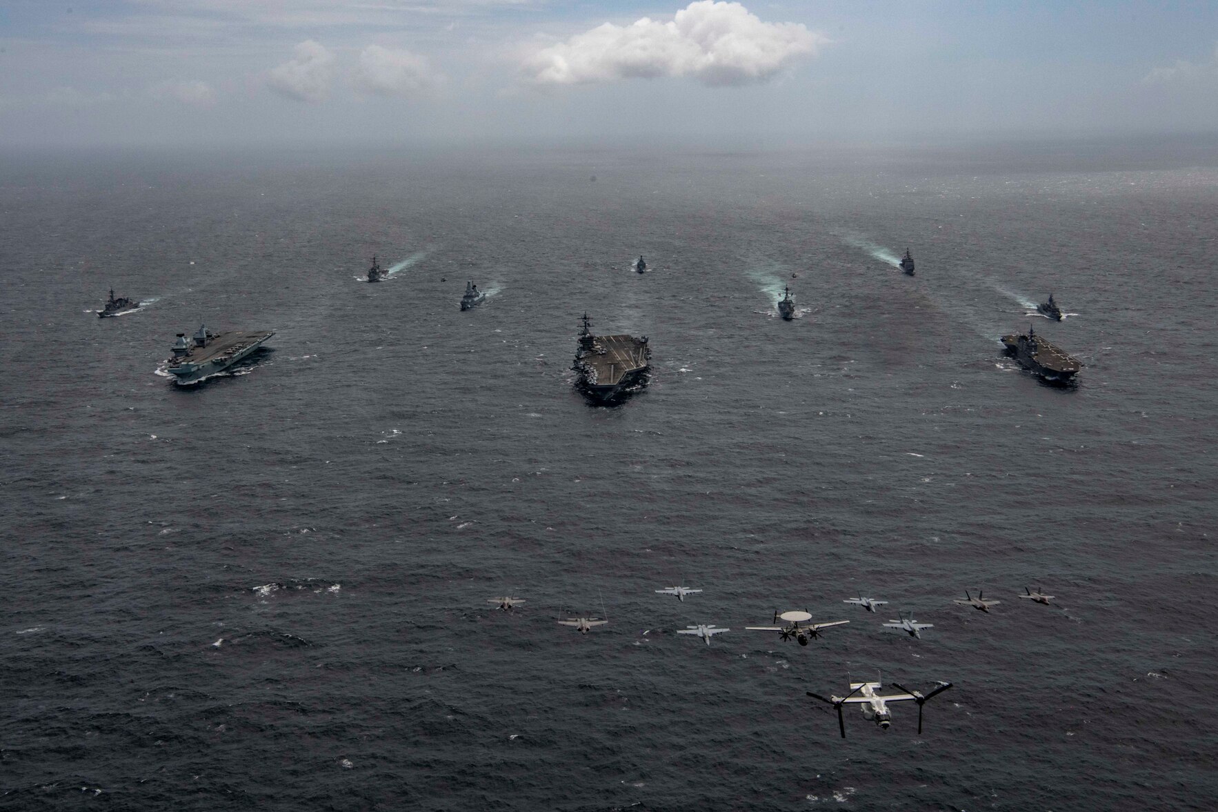 BAY OF BENGAL (Oct. 17, 2021) Ships and aircraft from the Japan Maritime Self-Defense Force (JMSDF), Royal Australian Navy, U.K. Royal Navy, and U.S. Navy, led by the Nimitz-class aircraft carrier USS Carl Vinson (CVN 70), U.K. Royal Navy HMS Queen Elizabeth (R 08), and JMSDF Izumo-class helicopter destroyer JS Kaga (DDH 184), transit in formation as part of Maritime Partnership Exercise (MPX) 2021, Oct. 17, 2021. MPX 2021 is a multilateral maritime exercise between the Japan Maritime Self-Defense Force, Royal Australian Navy, U.K. Royal Navy, and U.S. maritime forces, focused on naval cooperation, interoperability and regional security and stability in the Indo-Pacific and is an example of the enduring partnership between Australian, Japanese, U.K. and U.S. maritime forces, who routinely operate together in the Indo-Pacific, fostering a cooperative approach toward regional security and stability. (U.S. Navy photo by Mass Communication Specialist 2nd Class Russell Lindsey)